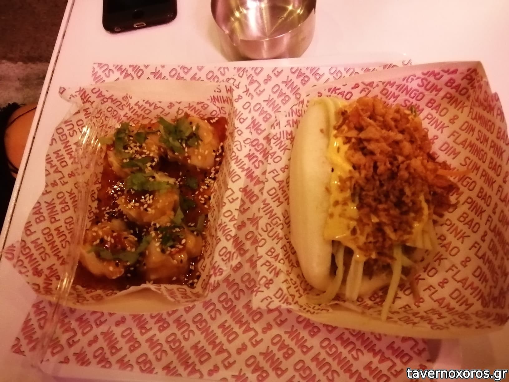 Dim sum με κοτόπουλο, γαρίδα, house soy (καλά) & bao bun με ψητό χοιρινό, hoisin, λαχανικά και curry mayo (σούπερ)