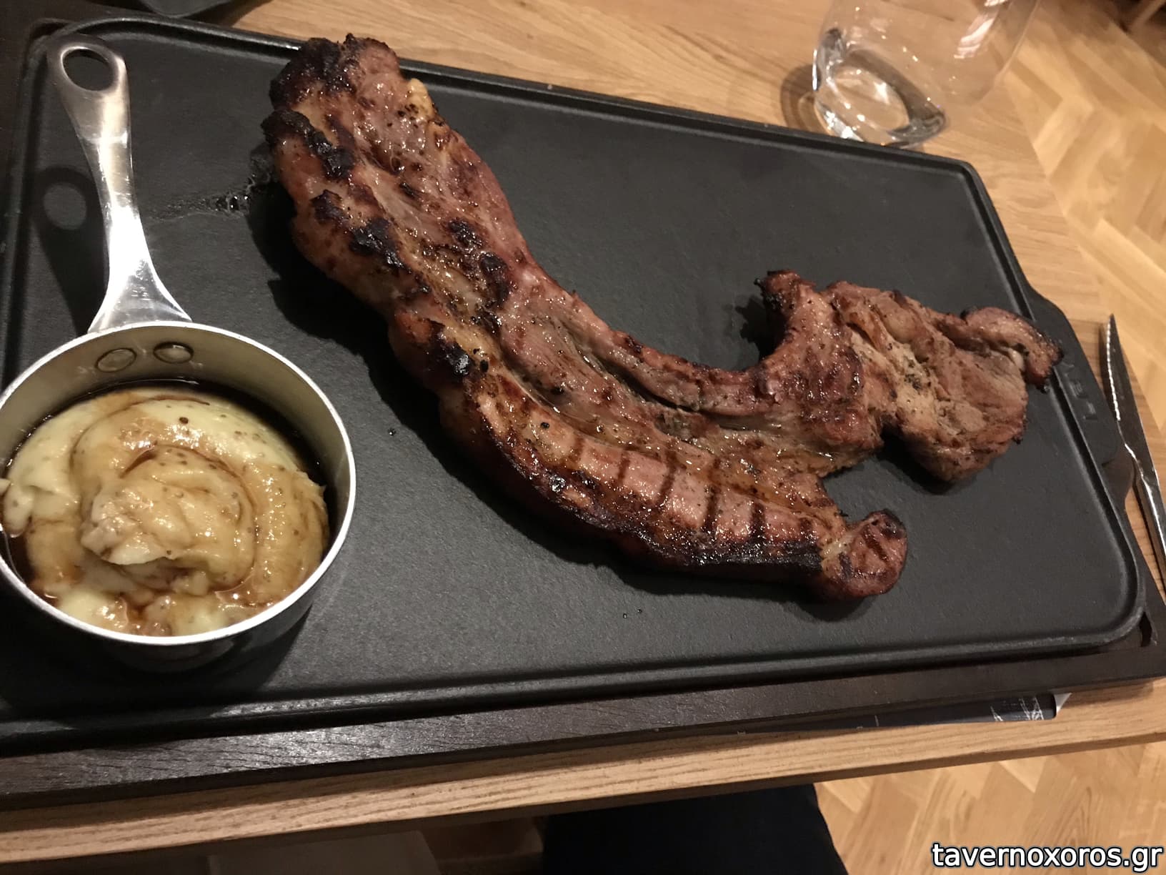Μία χοιρινή με πουρέ πατάτας (Χοιρινή πολύ καλή, πουρές λίσα).