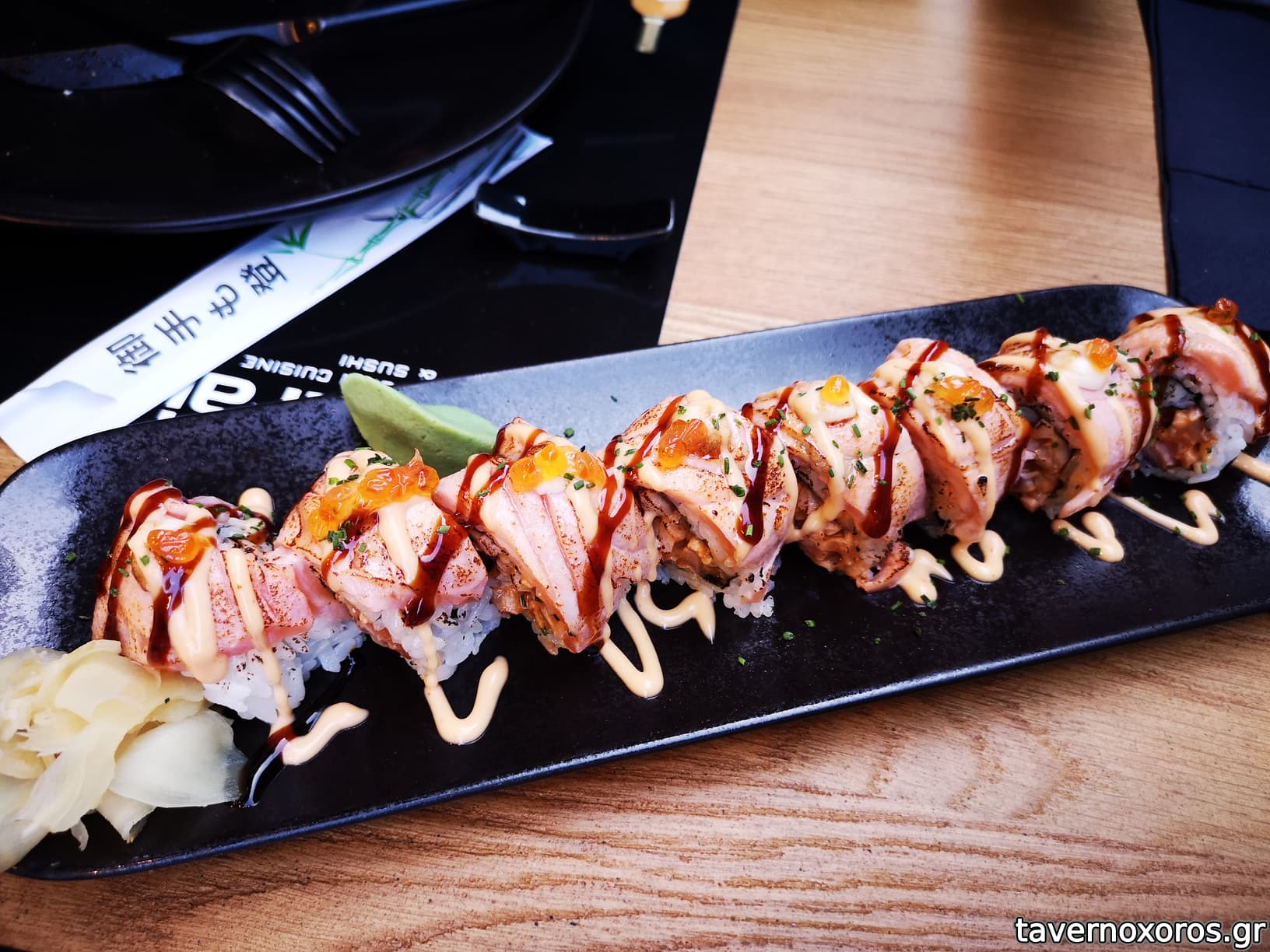 "Ρολό με ταρτάρ σολομού, μαρμελάδα πιπεριάς Φλωρίνης με τσίλι, καψαλισμένες φέτες σολομού & μπρικ" (μια χαρά)
