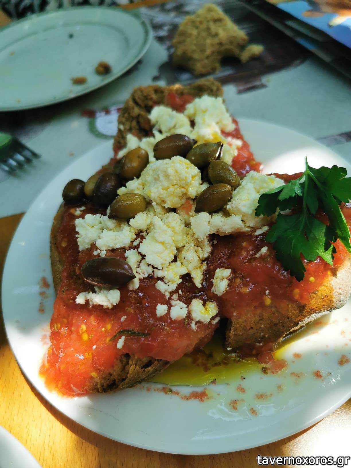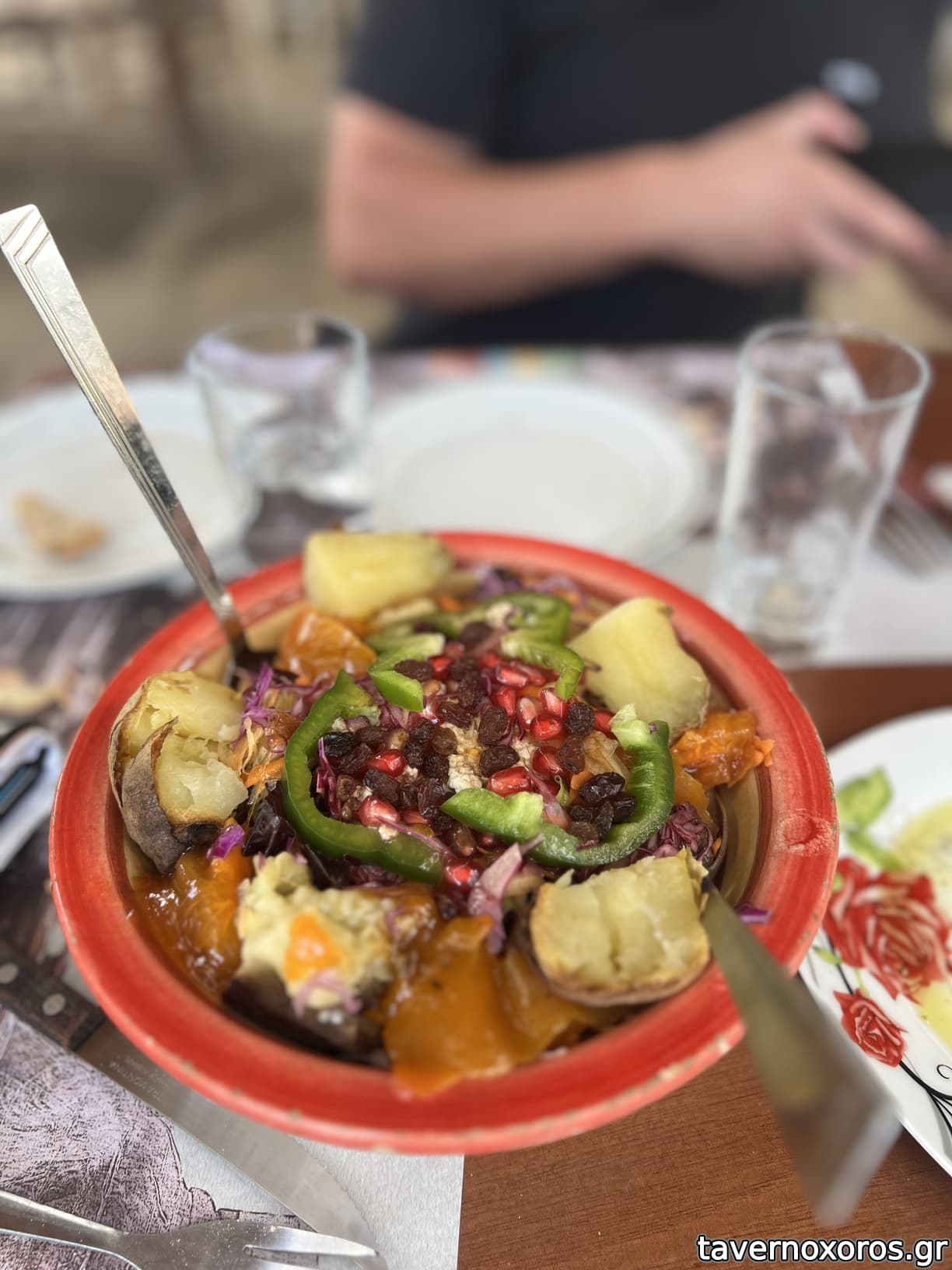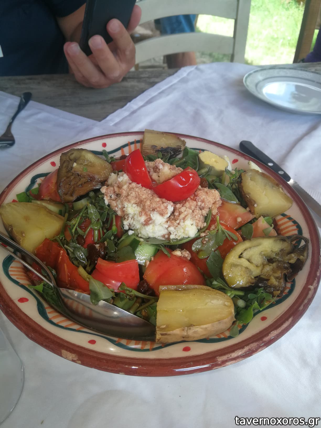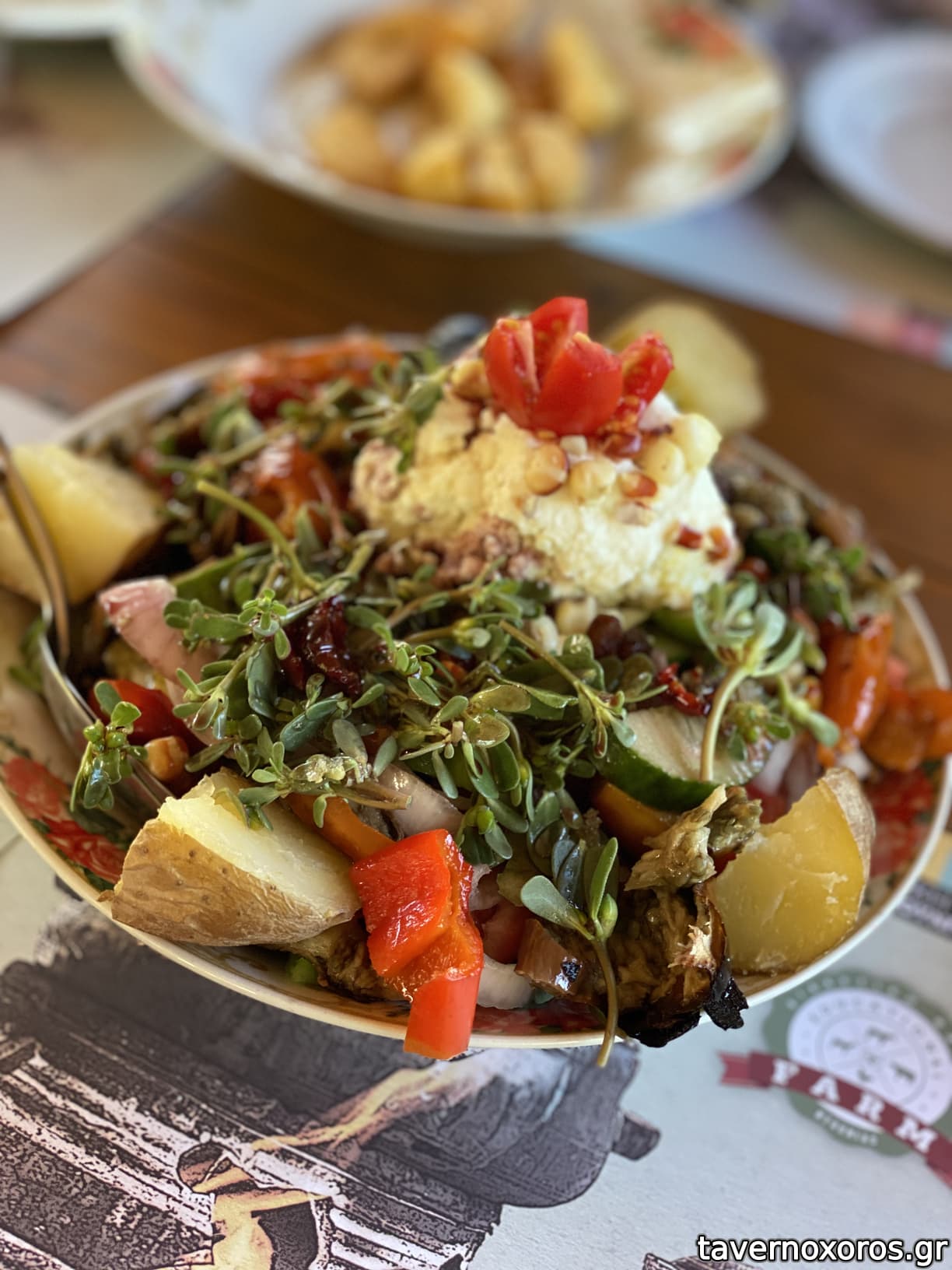 Γλιστρίδα, ντομάτα, ψητή πατάτα, ψητή πιπεριά, ψητή μελιτζάνα, ψητό καλαμπόκι, μυζήθρα, παξιμάδι, ελαιόλαδο και ξύδι