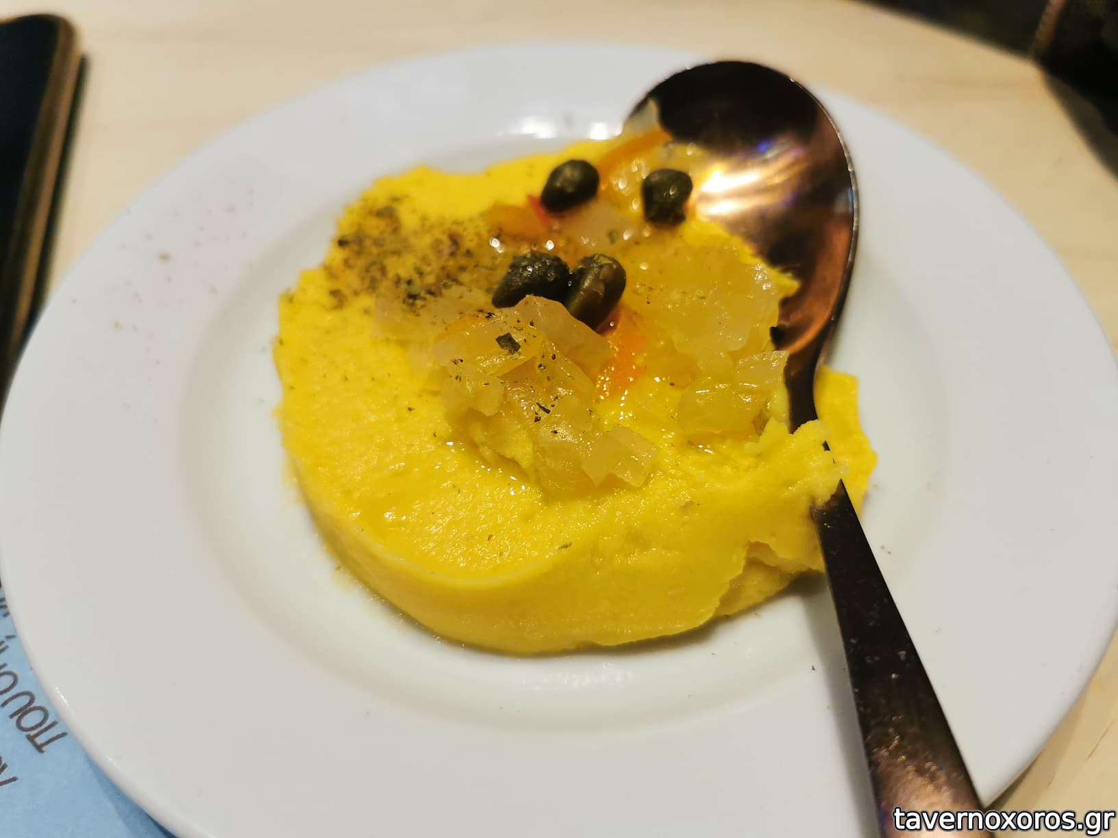 για το καλοσώρισμα σου φέρνουν από ένα σφηνάκι Τσικουδιά και μία μίνι Φάβα. Σε προϊδεάζουν καλά, αλλά το κυρίως θέμα είναι κάπως μέτριο..