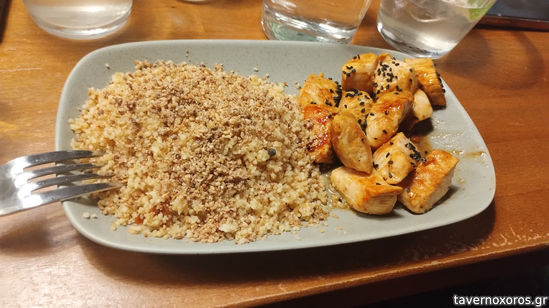 "Μπουκίτσες κοτόπουλο σβησμένες με worchestershire Sauce & μουστάρδα συνοδευμένες με cous cous πασπαλισμένο με Dukkah" (ok, αλλά του λείπει ένταση)