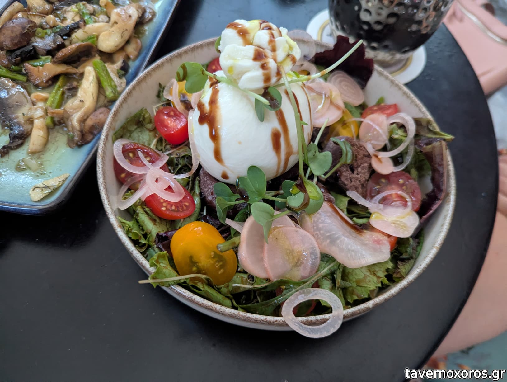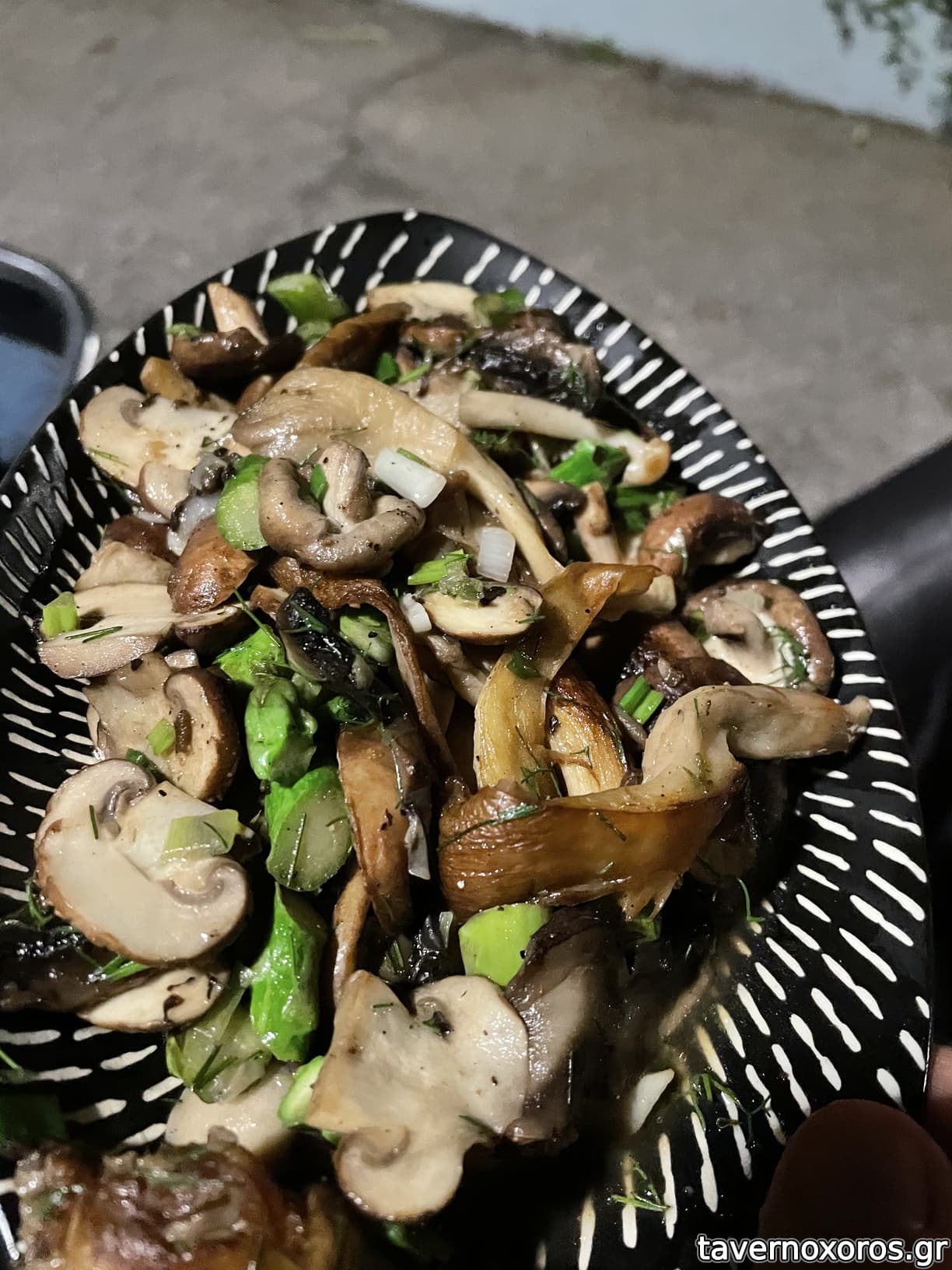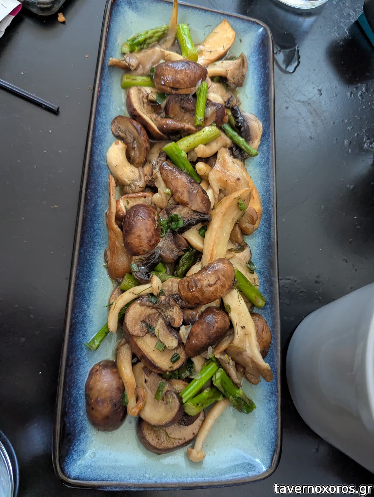 "Ποικιλία μανιταριών σοταρισμένα με φρέσκα πράσινα σπαράγγια κρεμμυδάκι, σκορδάκι και μάραθο συνοδευμένα από σαλατούλα" (καλό)
