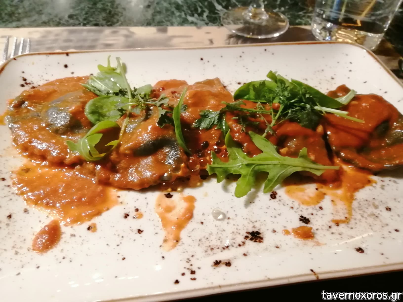 Ravioli γεμιστό με κρέμα αστακού σε σάλτσα θαλασσινών, πούδρα αυγοτάραχο και πέρλες λεμονιού
