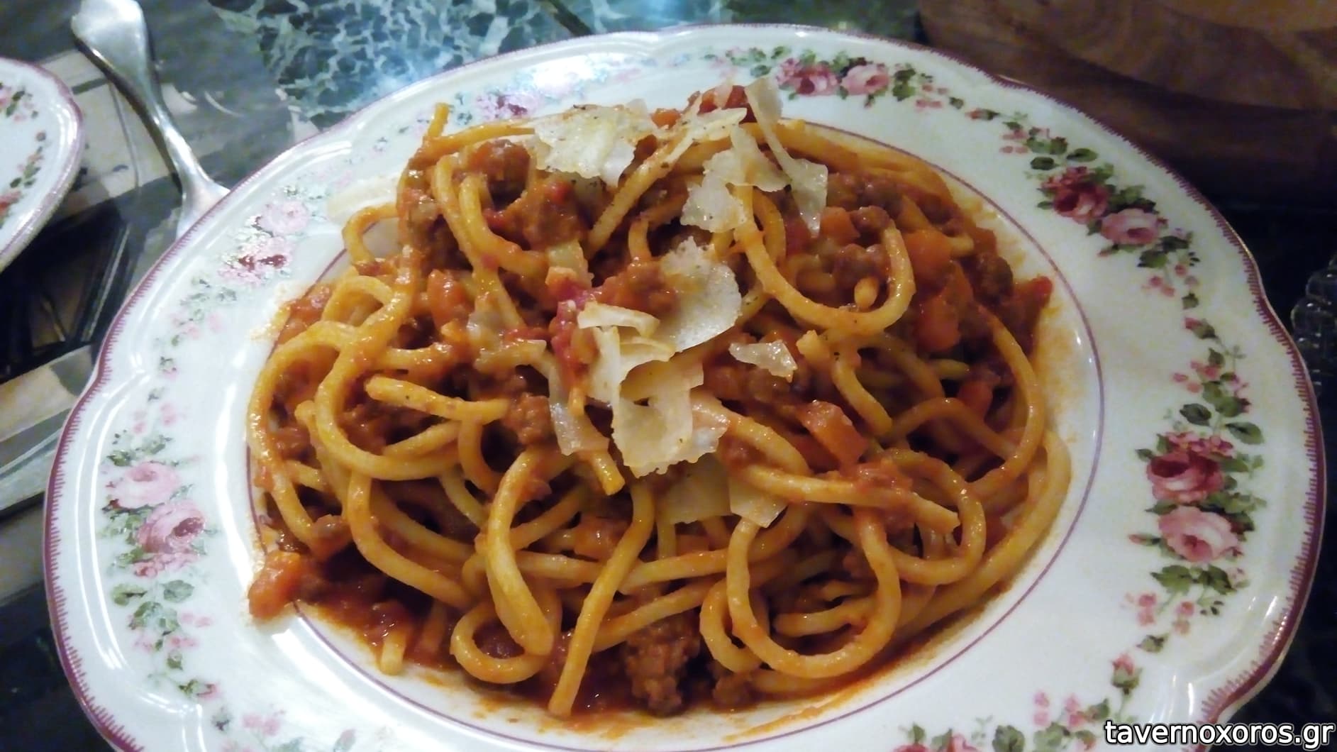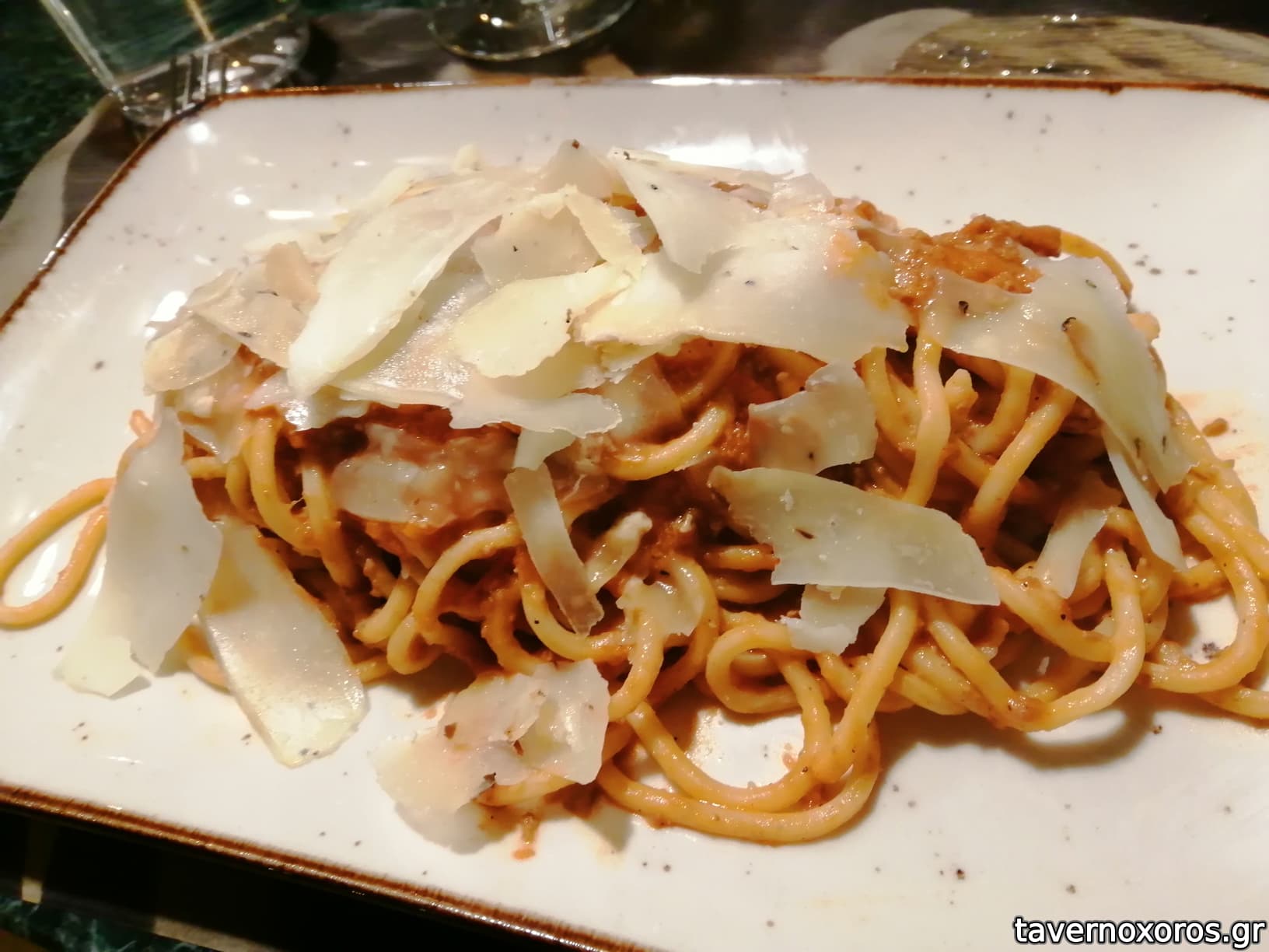 Φρέσκα σπαγγέτι με μοσχάρι Αρκαδίας bolognese και κρασί Barolo πεκορίνο τρούφας (πολύ καλά)
