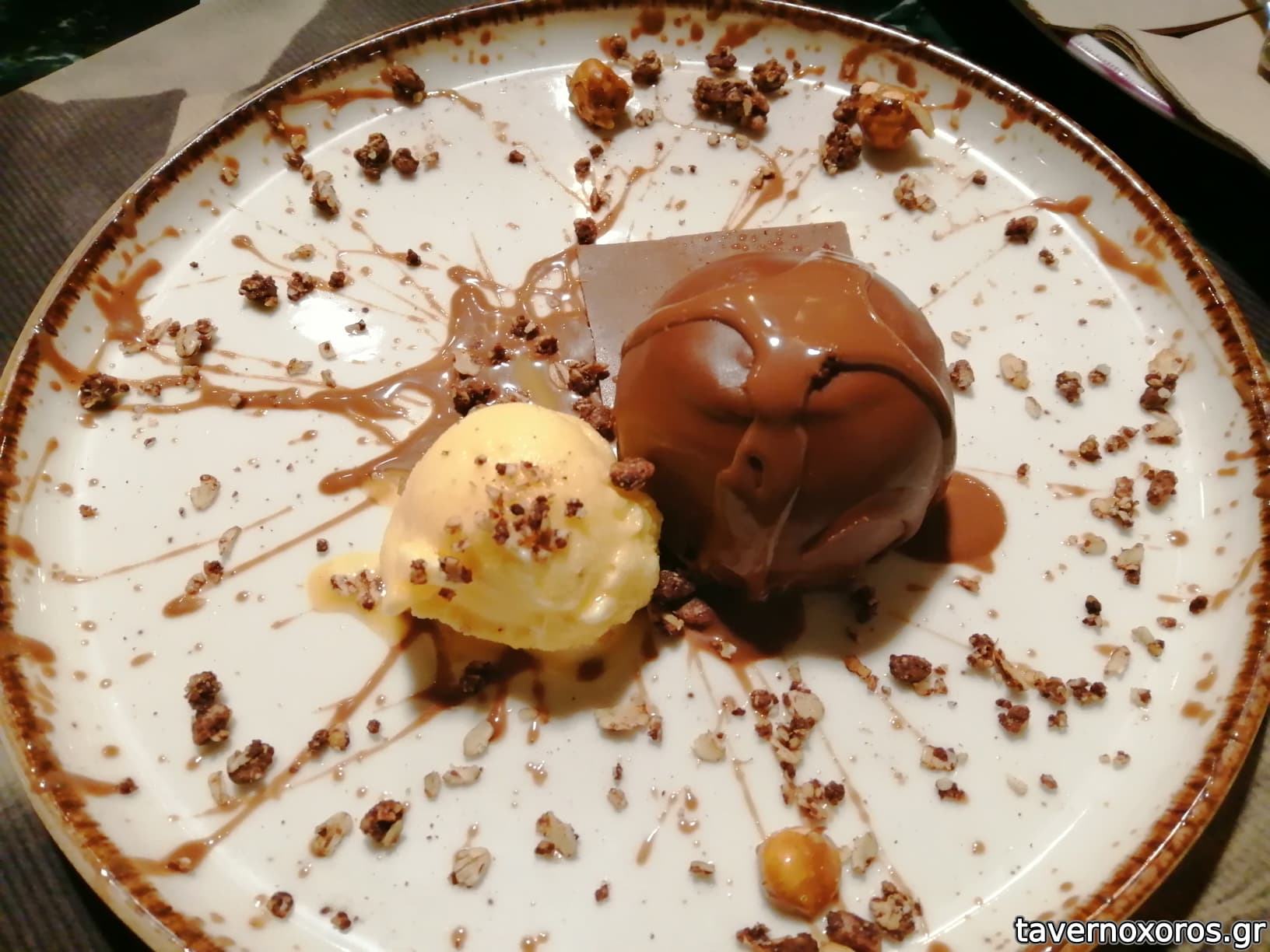 Σοκολάτα gianduja με φουντούκια και σορμπέ μάνγκο (πολύ καλή!)