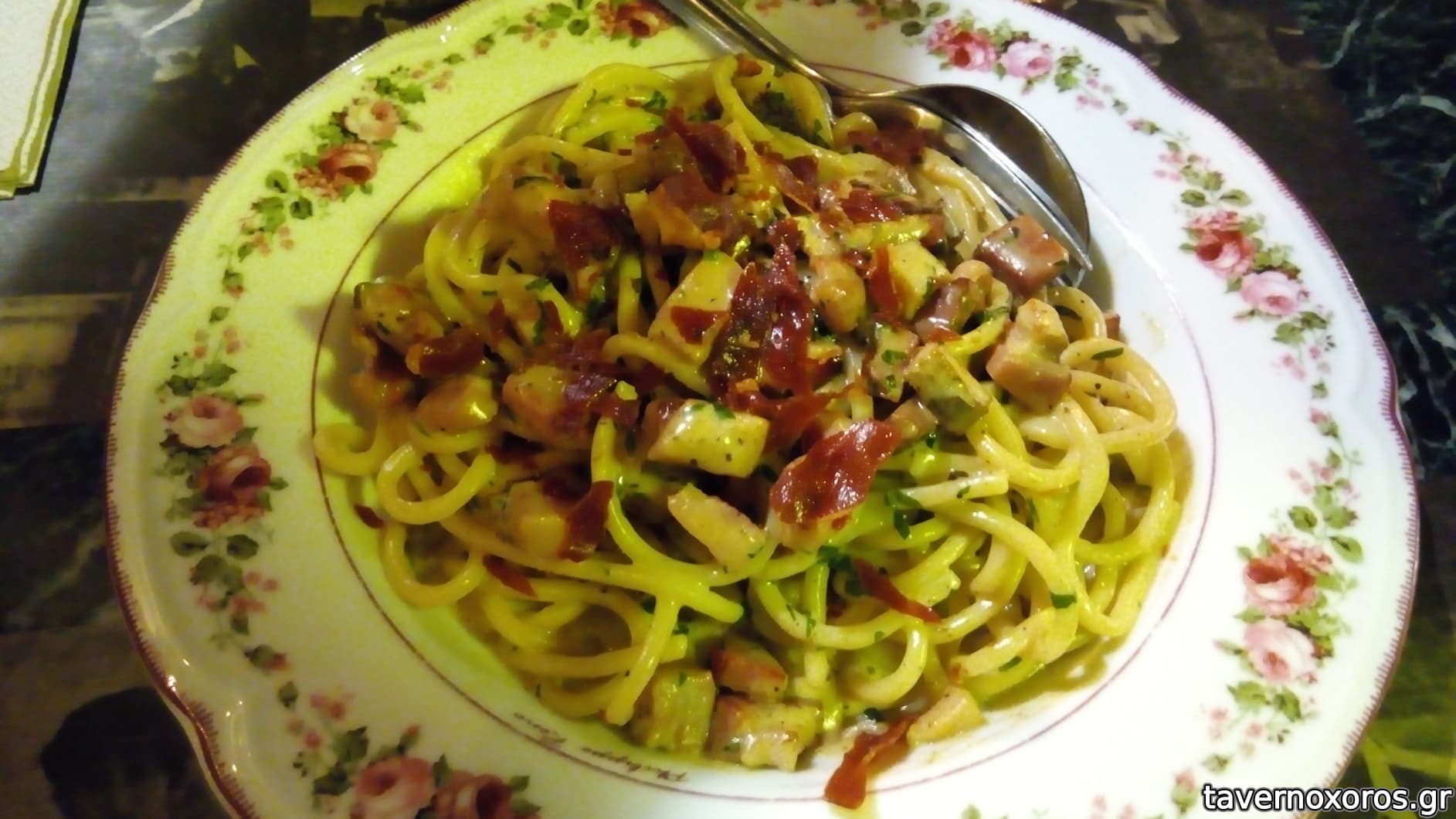 Carbonara spaghetti με καπνιστή pancetta, παρμεζάνα reggiano κρόκο αυγού