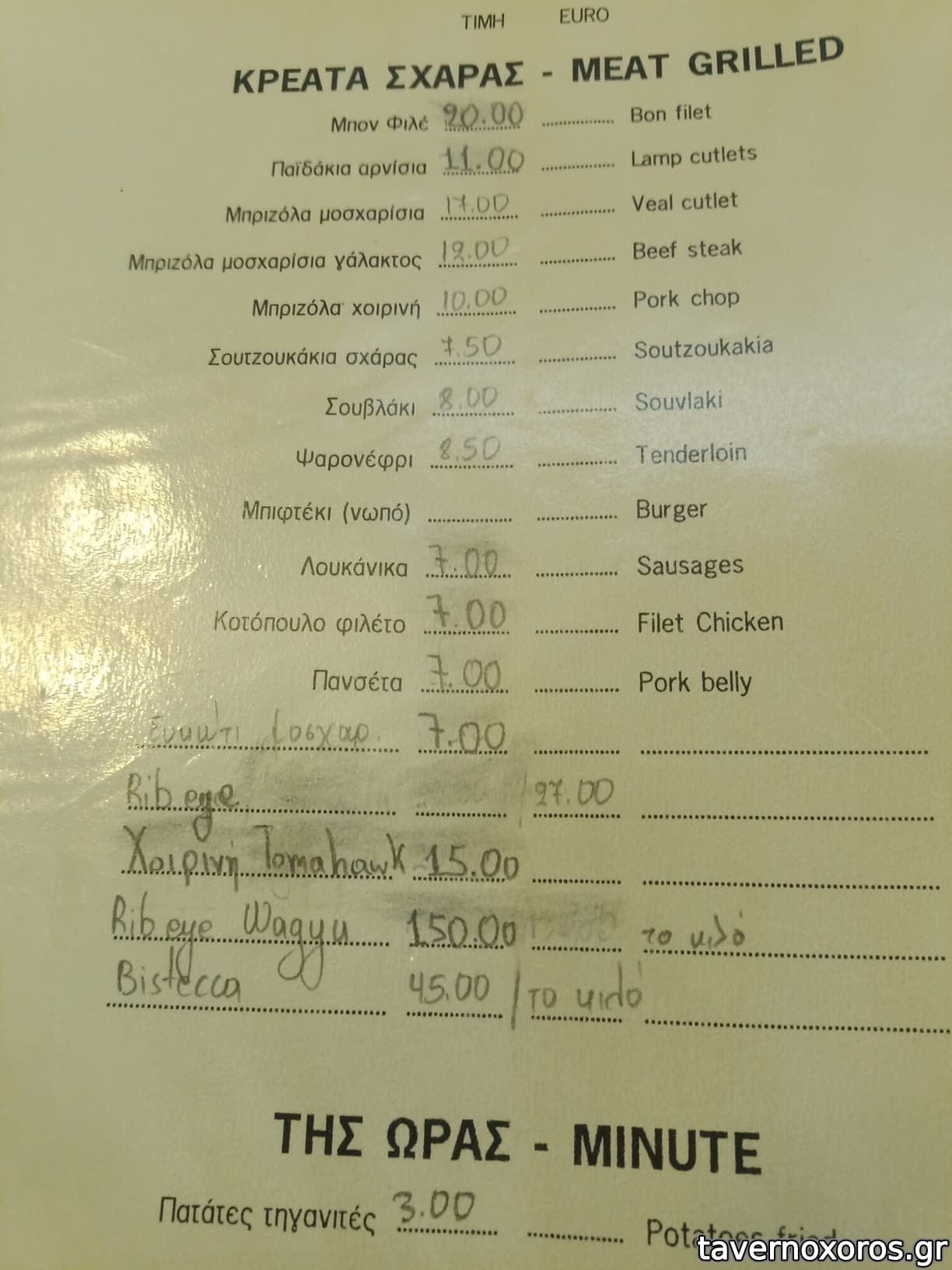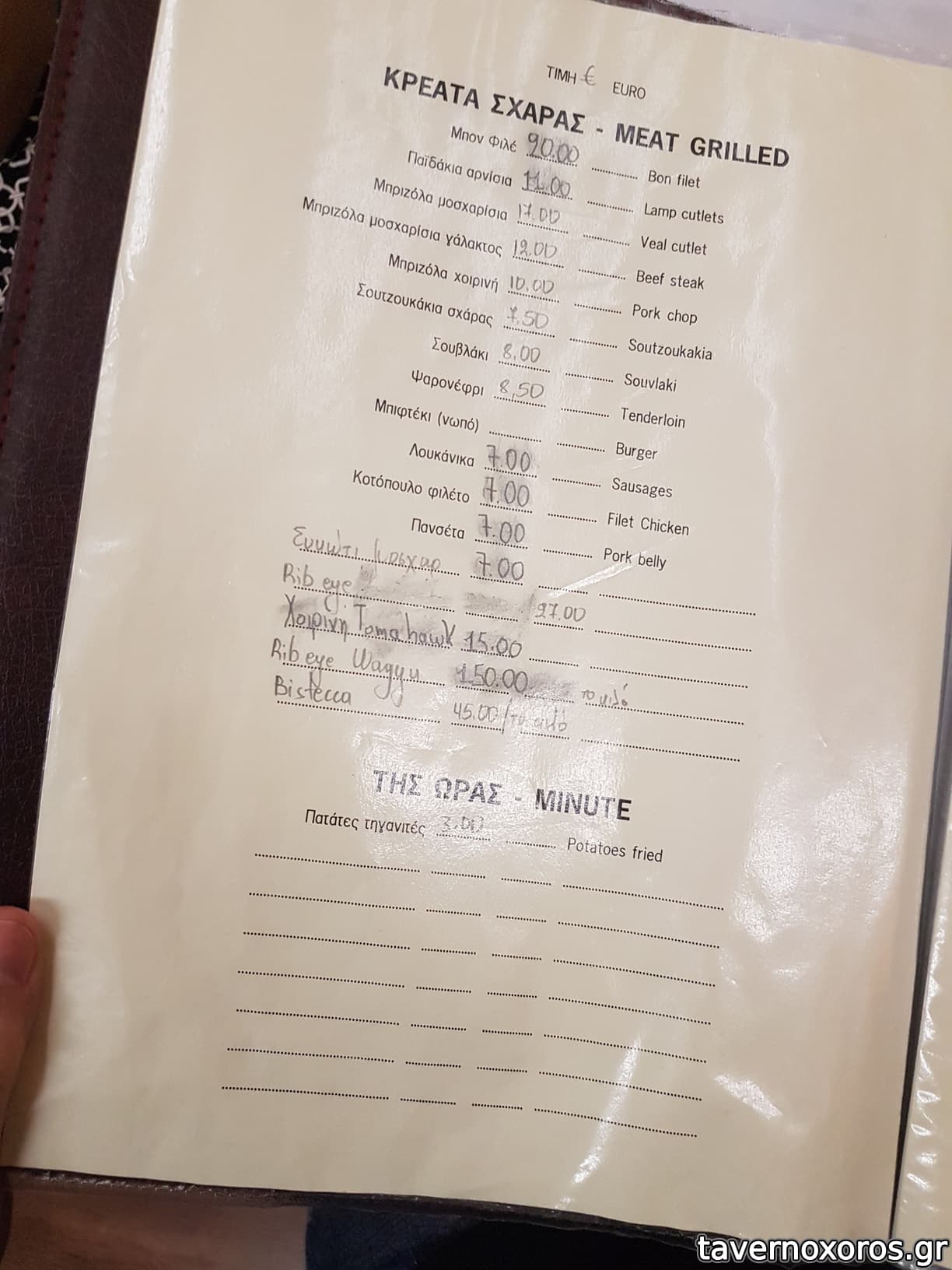 Οι τιμές του μπορεί να φαίνονται τσιμπημένες, αλλά είναι πολύ καλές για αυτό που δίνουν. 27 ευρώ τα 350 γρ. Rib Eye Ουρουγουάης. Αλλού, τόσο ή ακριβότερο, βρίσκεις το Ελληνικό που είναι γενικά σημαντικά πιο φτηνό. 38Ε 350γρ, prime grade Rib Eye Aμερικής. Ξέρω πως σε κρεοπωλείο αυτό το βρίσκεις 100Ε και άνω. Συγκριτικά σκεφτείται ότι το Οψοποιών Μαγγανείαι που έχει Choice Grade Αμερικάνικο (σημαντικά φτηνότερο) το δίνει 90 ευρώ το κιλό. Τέλος Wagyu Rib Eye Αμερικής στα 50Ε τα 350 γρ.