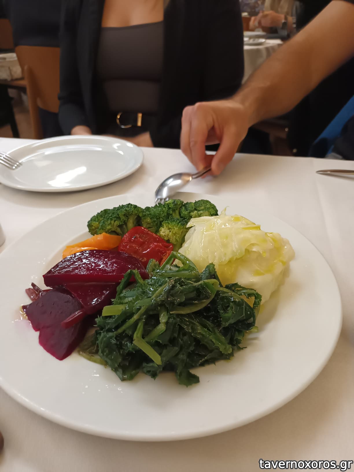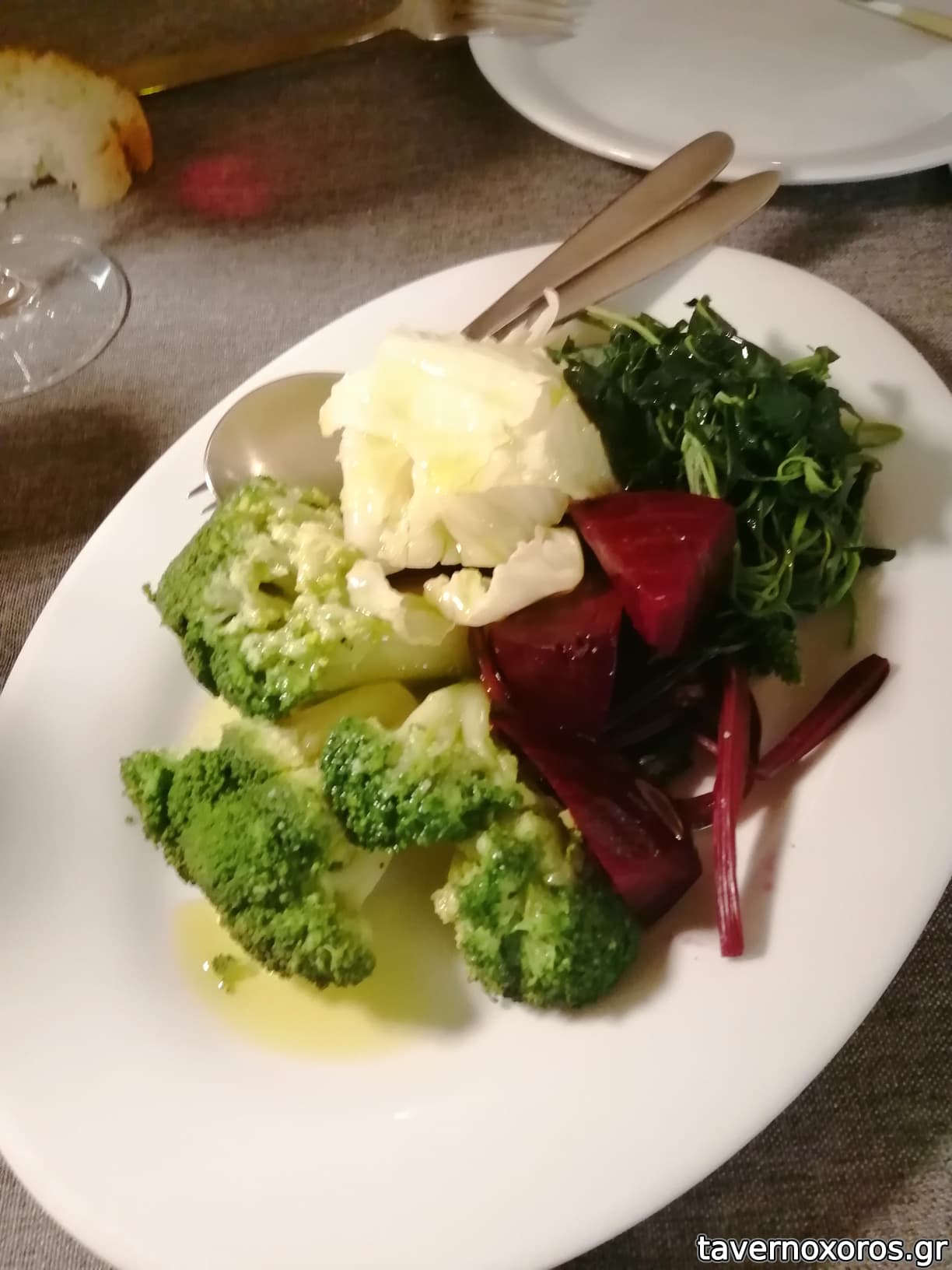 - Βραστά λαχανικά (επιλέξαμε την μικρή ποικιλία, που δεν περιείχε το σύνολο αυτών που είναι μπρόκολο, κουνουπίδι, παντζάρι, λαχανίδα, χόρτα --δεν μας αποσαφηνίστηκε ποια θα έρθουν): Ήρθαν τελικά χόρτα (θα μπορούσε να είχε μπει κάτι άλλο, καθώς χόρτα είχαμε πάρει ξεχωριστά), μπρόκολο και λαχανίδα. Όλα τα λεφτά η λαχανίδα, εξαιρετική.