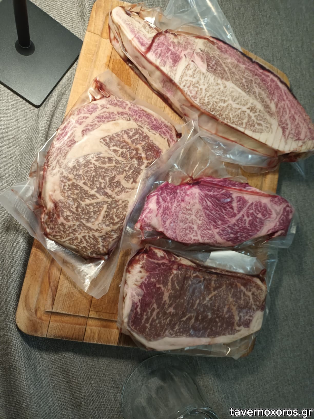 Σπαλομπριζόλα Kobe (πάνω), Chuck Eye Long Wagyu Ιαπωνίας Α5 (στη μέση δεξιά), Rib eye wagyu Αυστραλίας (αριστερά), striploin Αυστραλίας (κάτω δεξιά)