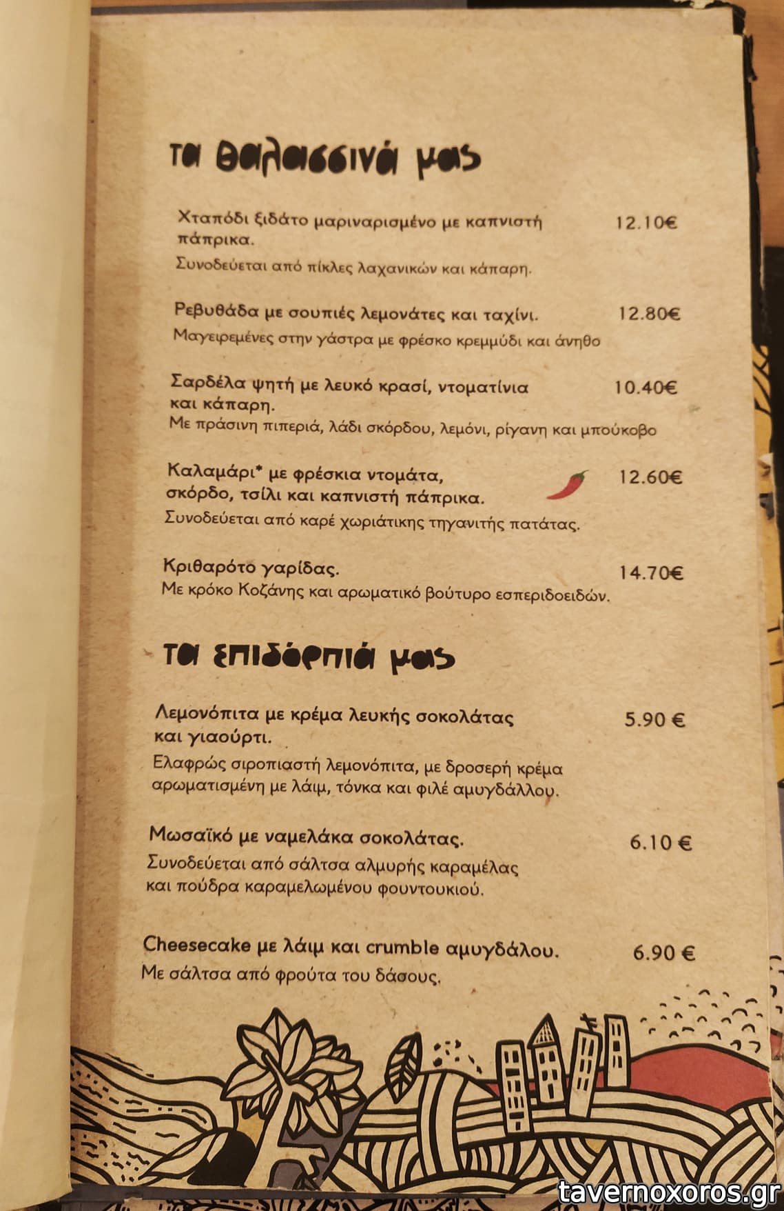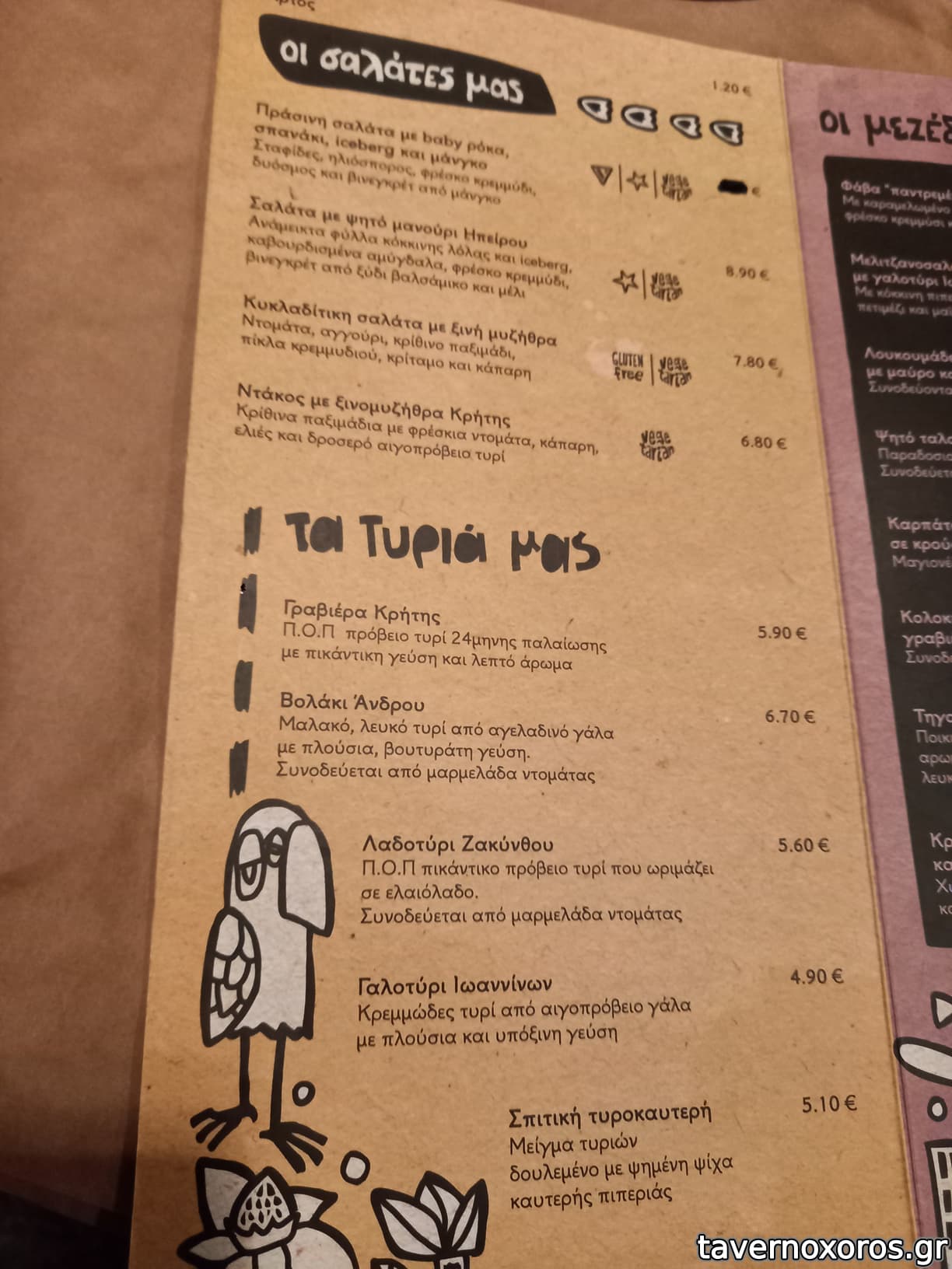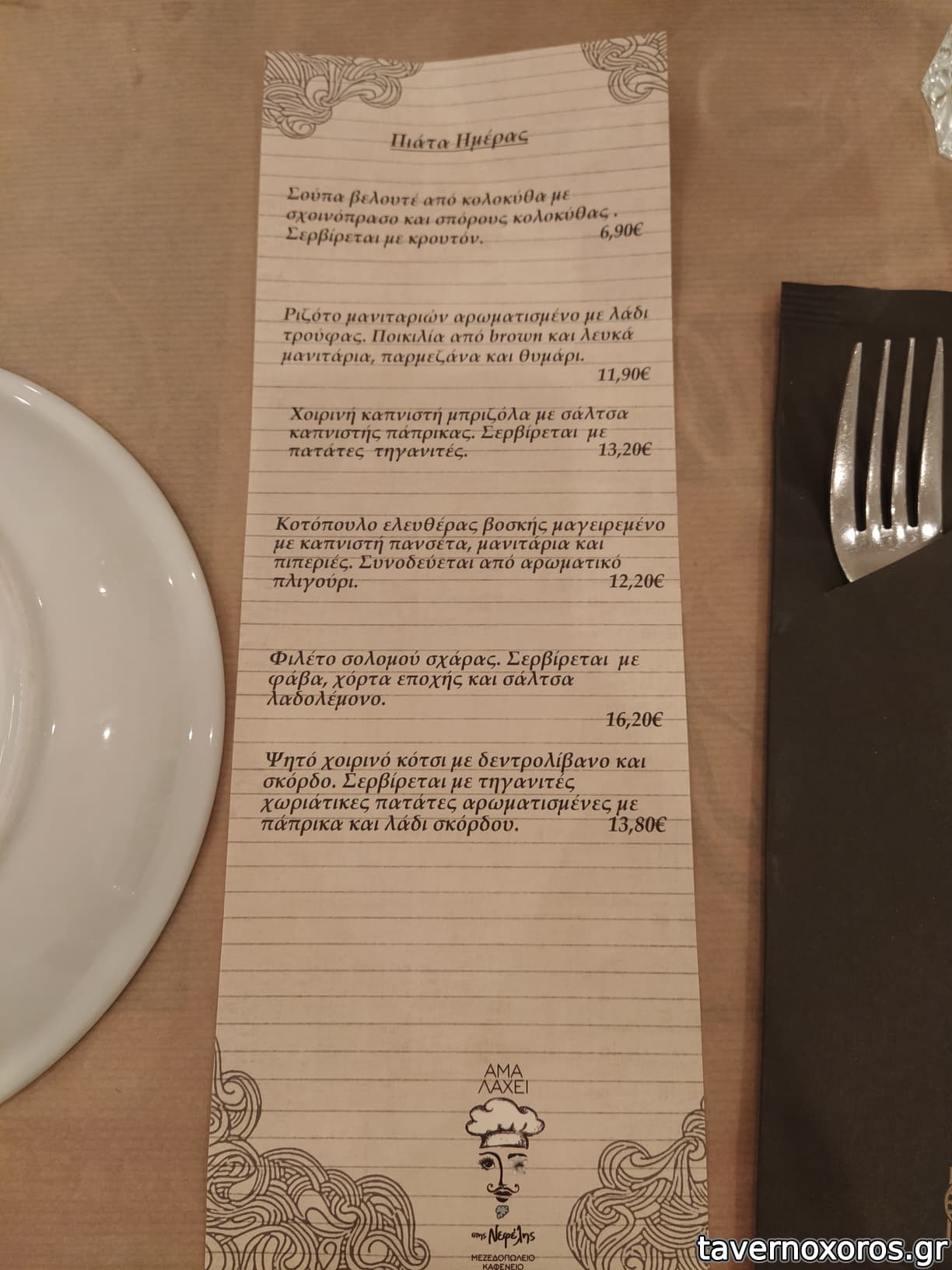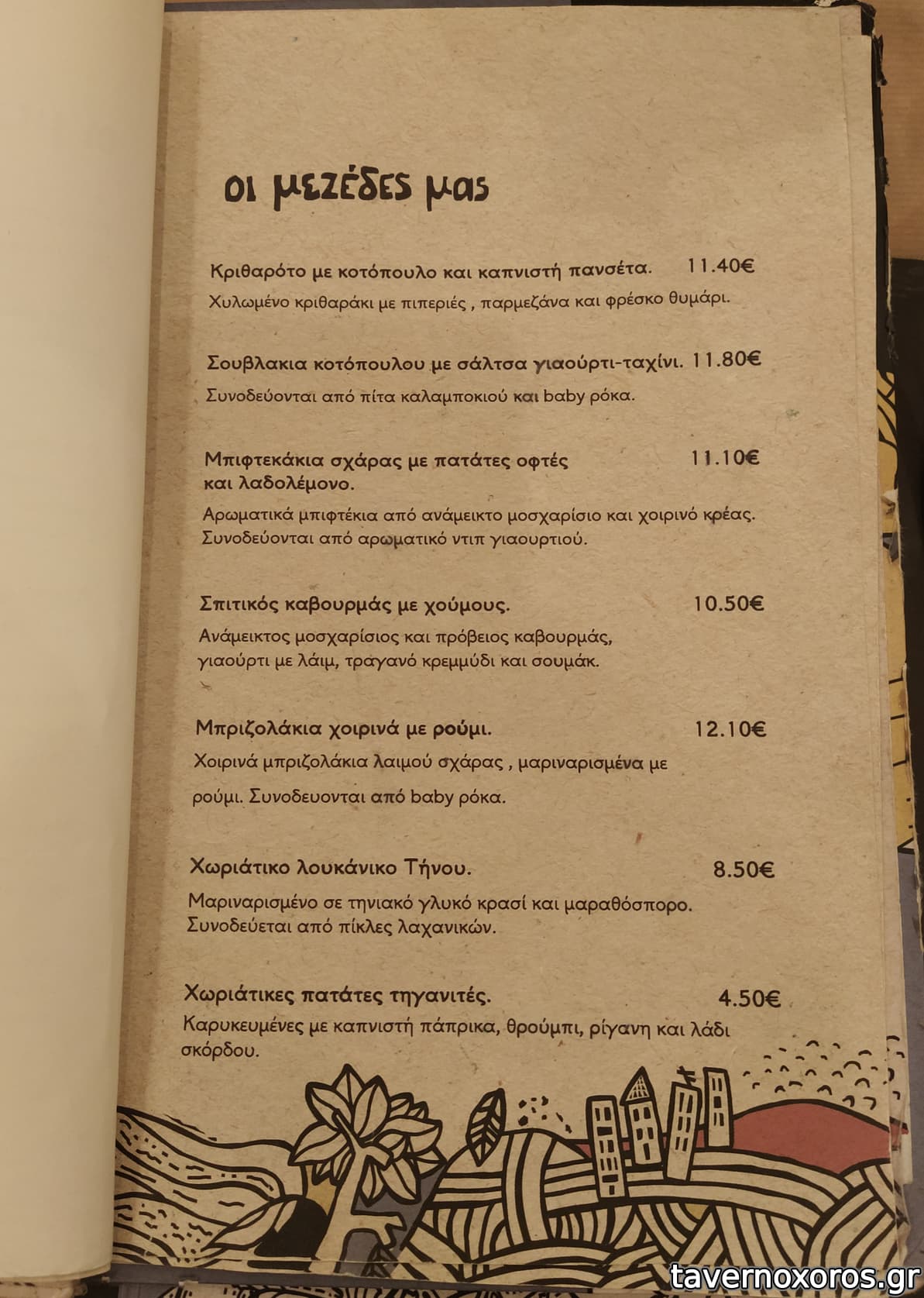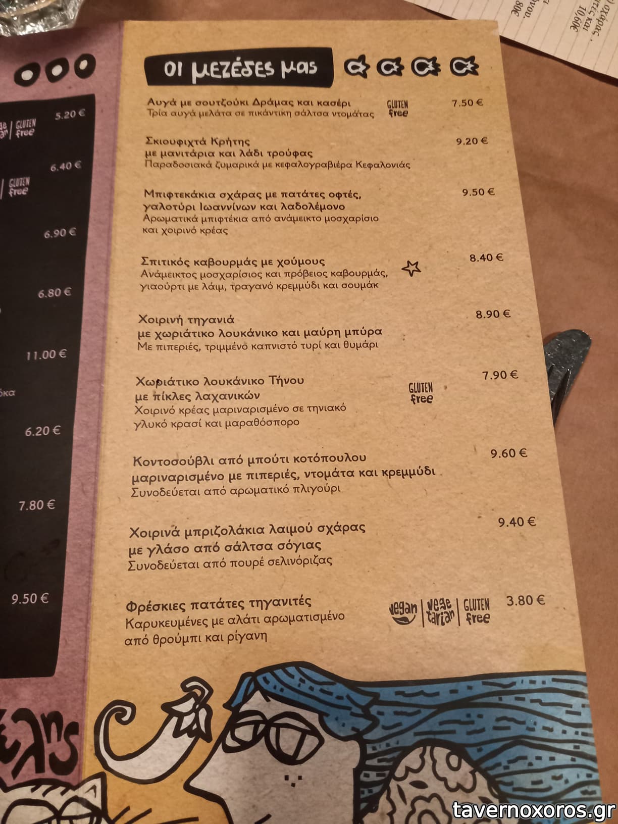 Στα του φαγητού, δοκιμάστηκαν πράσινη σαλάτα, πατάτες τηγανιτές, βολάκι Ανδρου, καρπάτσιο μόσχου, τηγανιά μανιταριών, χωριάτικο λουκάνικο Τήνου με πίκλες λαχανικών και κόκορα με χυλοπίτες, όλα νόστιμα με έμφαση στο καρπάτσιο. Ήπιαμε κρασί εμφιαλωμένο (τιμή φιάλης λογική)