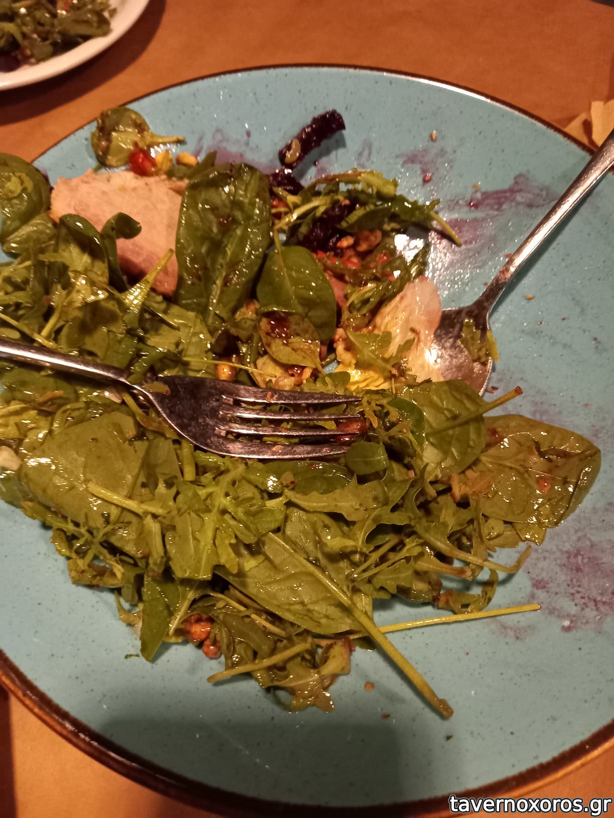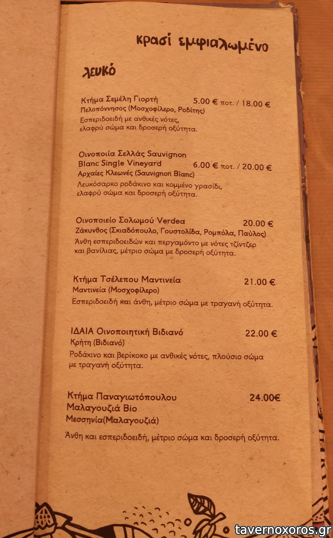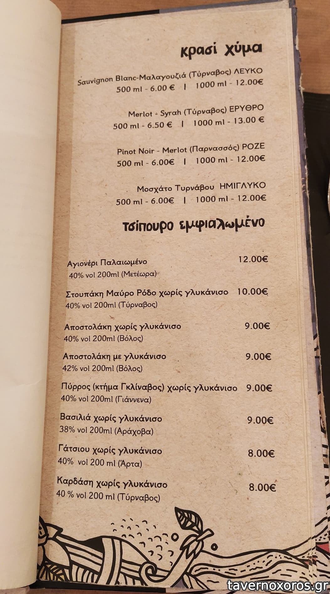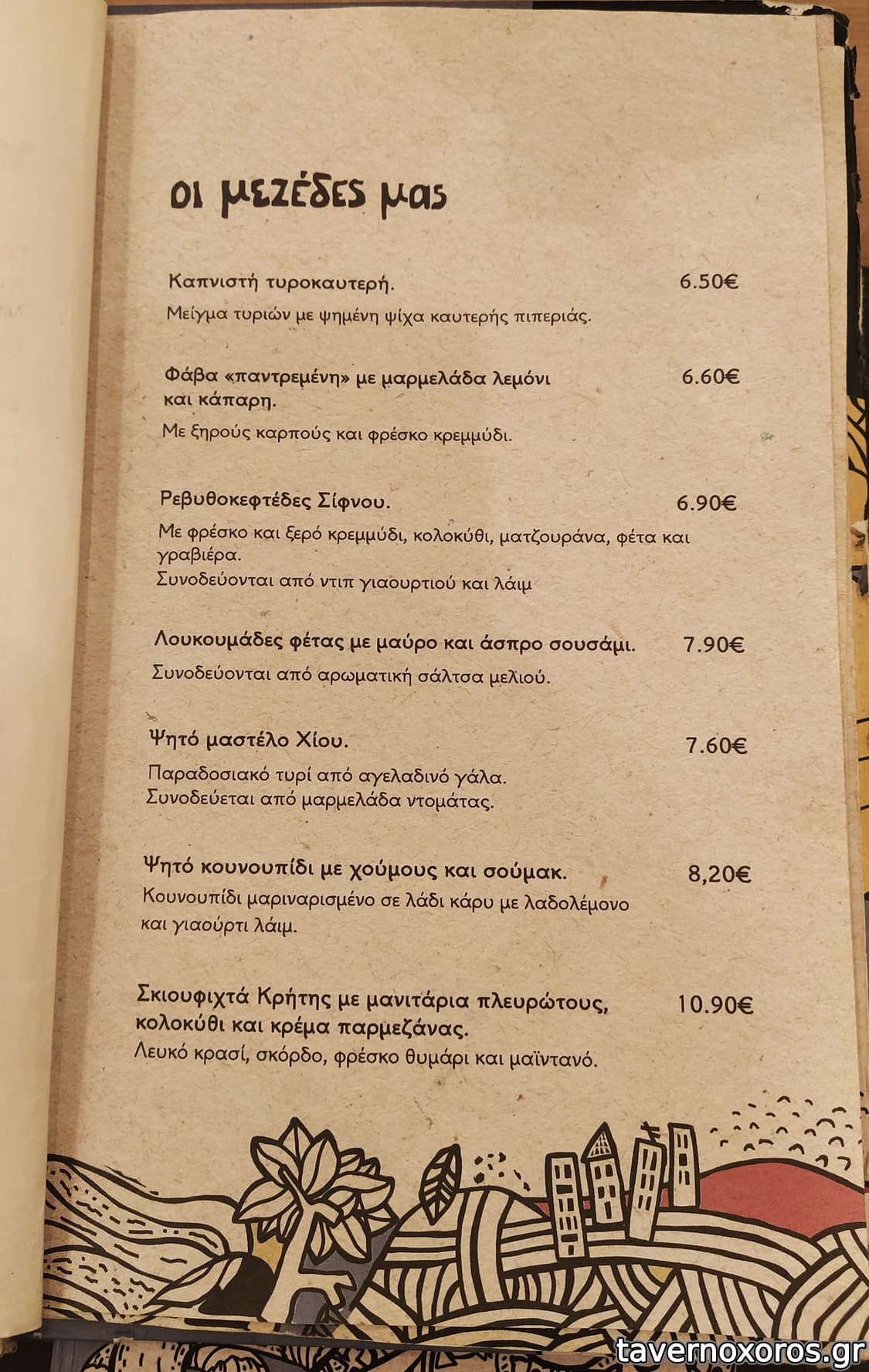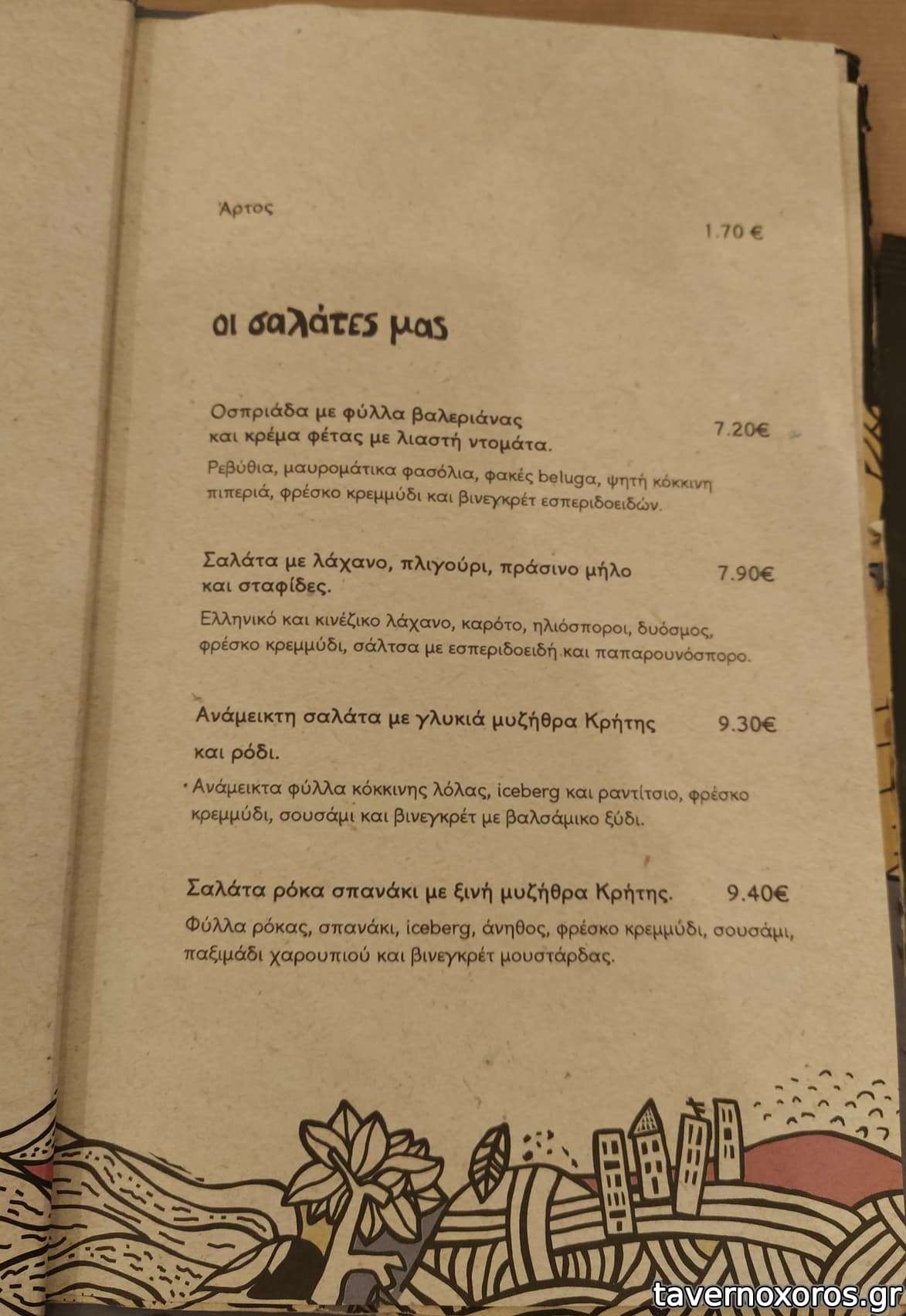 Στα του φαγητού, δοκιμάστηκαν πράσινη σαλάτα, πατάτες τηγανιτές, βολάκι Ανδρου, καρπάτσιο μόσχου, τηγανιά μανιταριών, χωριάτικο λουκάνικο Τήνου με πίκλες λαχανικών και κόκορα με χυλοπίτες, όλα νόστιμα με έμφαση στο καρπάτσιο. Ήπιαμε κρασί εμφιαλωμένο (τιμή φιάλης λογική)