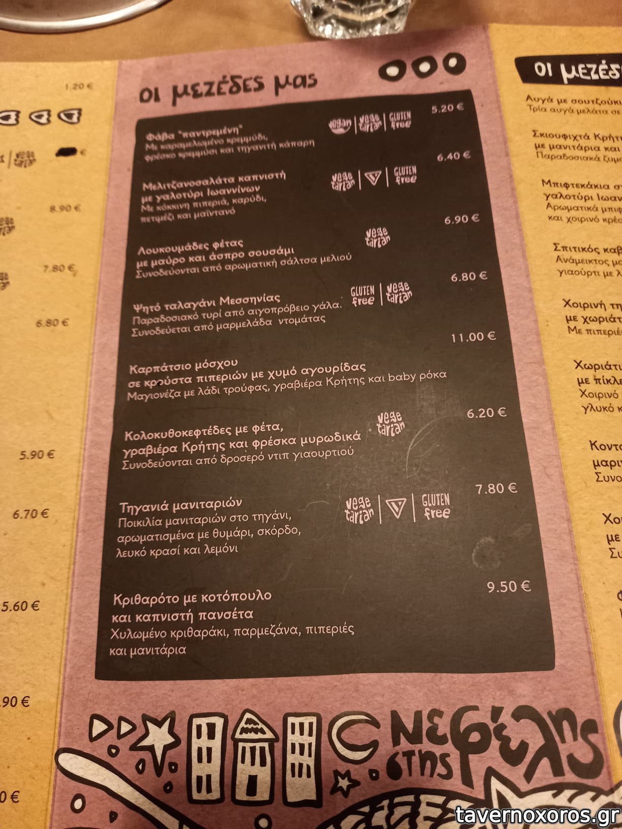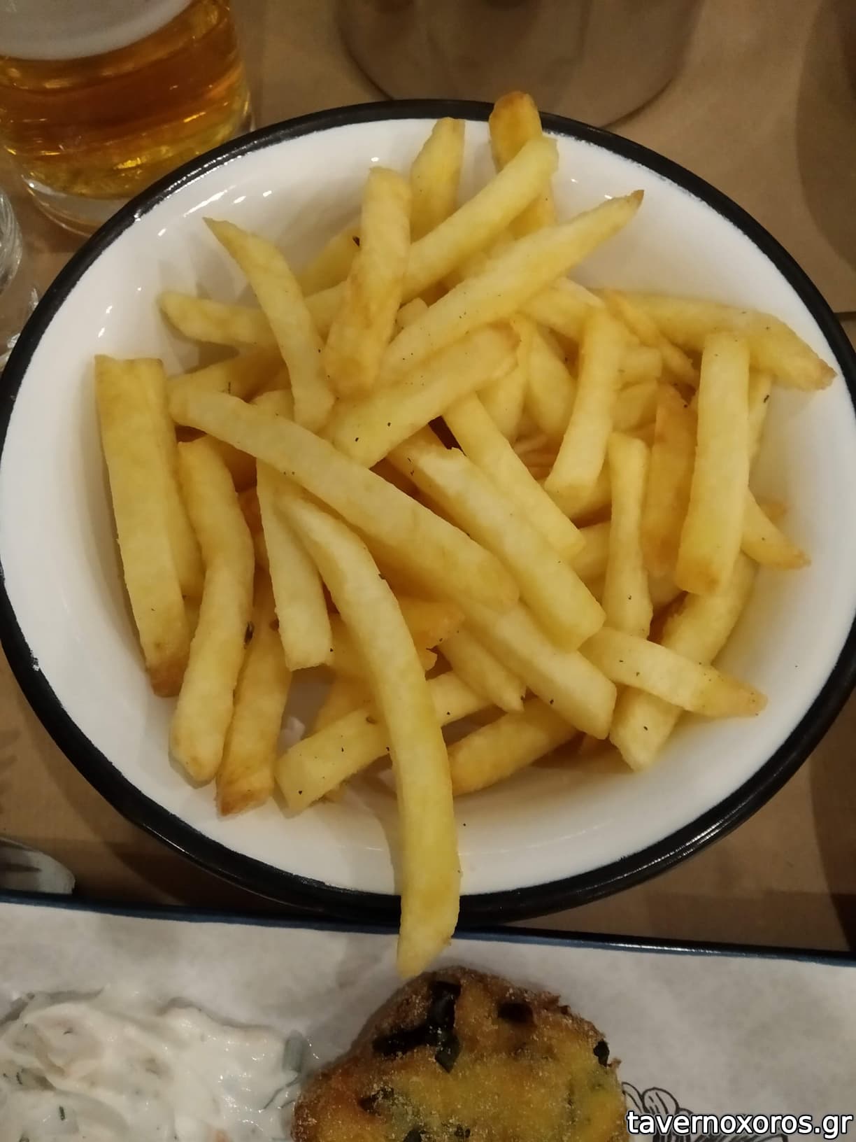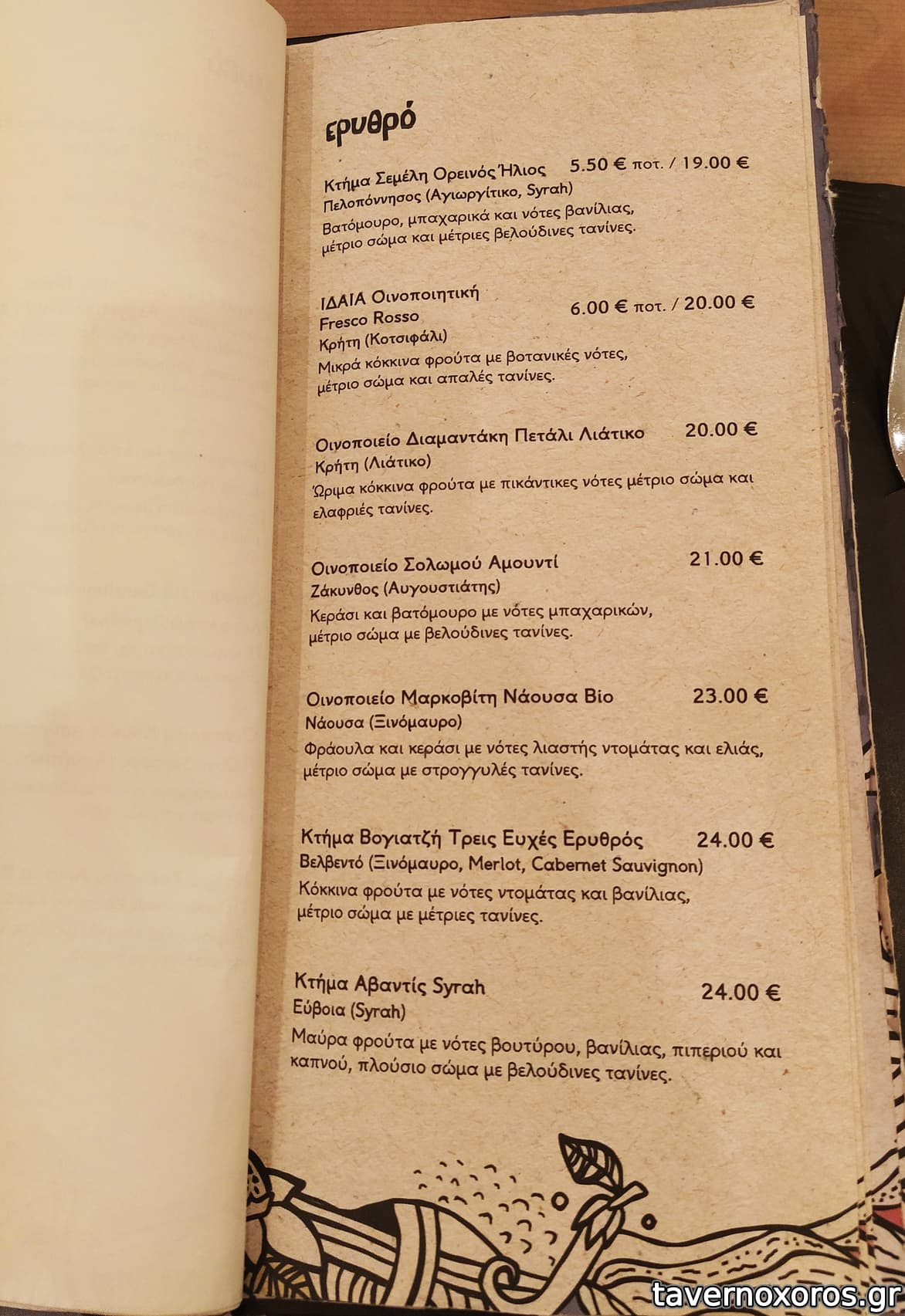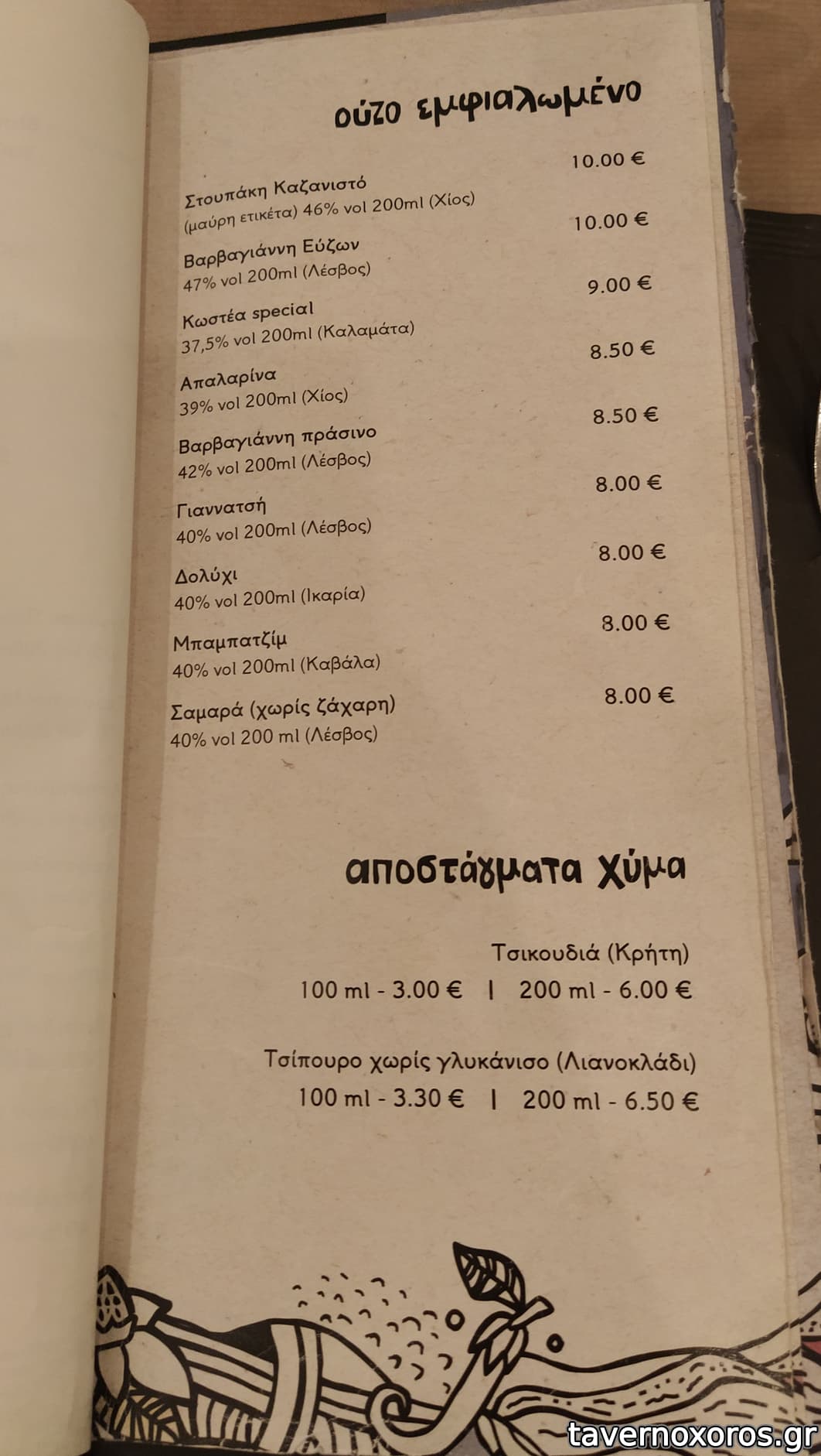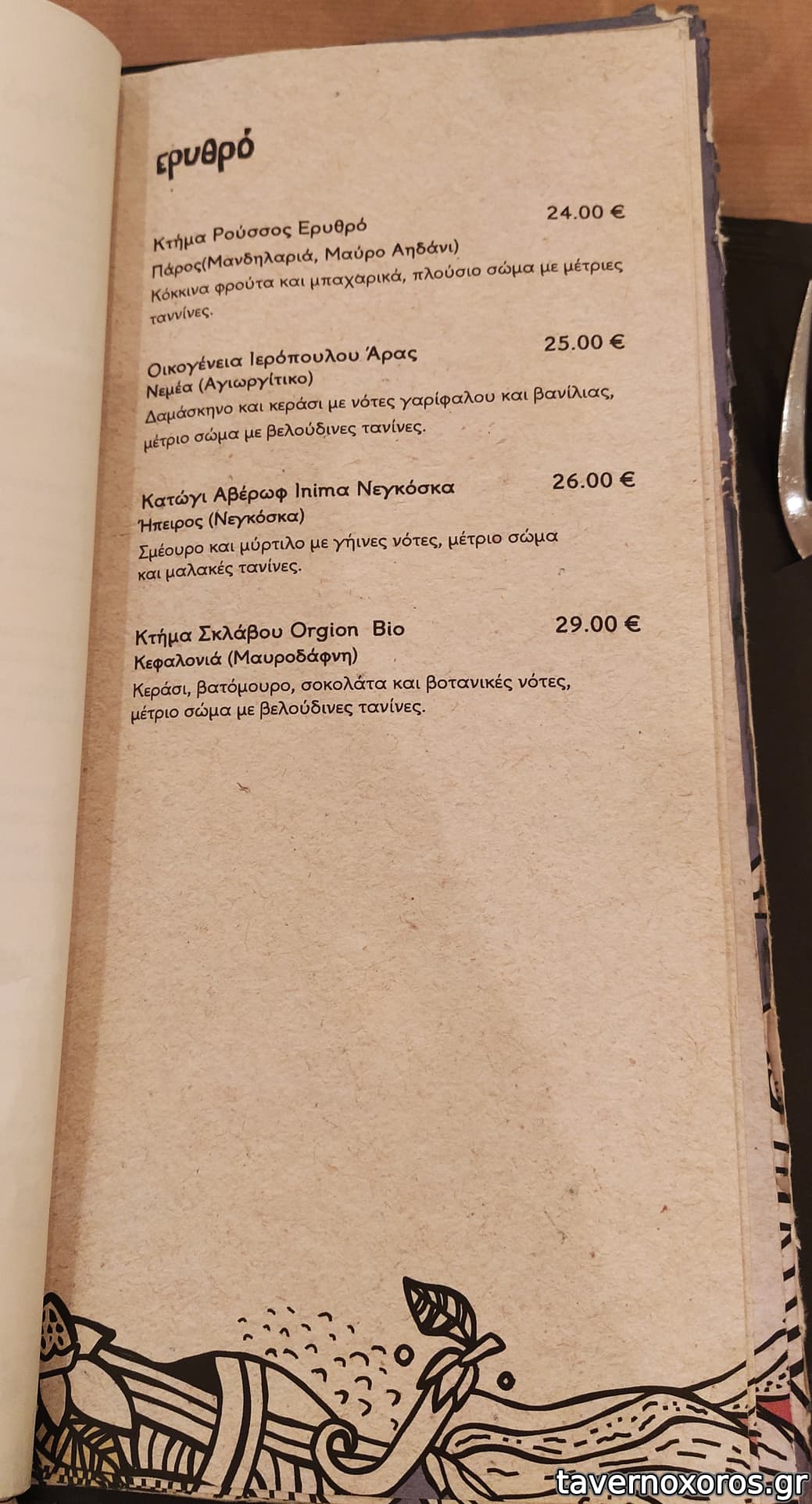 Στα του φαγητού, δοκιμάστηκαν πράσινη σαλάτα, πατάτες τηγανιτές, βολάκι Ανδρου, καρπάτσιο μόσχου, τηγανιά μανιταριών, χωριάτικο λουκάνικο Τήνου με πίκλες λαχανικών και κόκορα με χυλοπίτες, όλα νόστιμα με έμφαση στο καρπάτσιο. Ήπιαμε κρασί εμφιαλωμένο (τιμή φιάλης λογική)