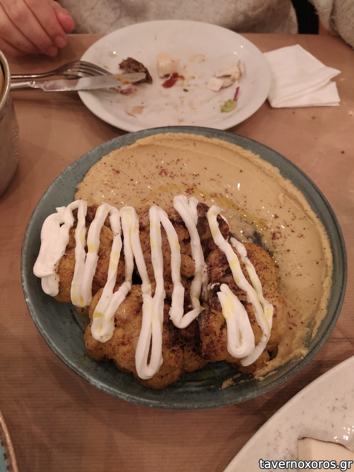 Ψητό κουνουπίδι με χούμους και σουμάκ (πολύ καλές οι πρώτες μπουκιές, όσο καθόταν στο πιάτο "κακογερνούσε")