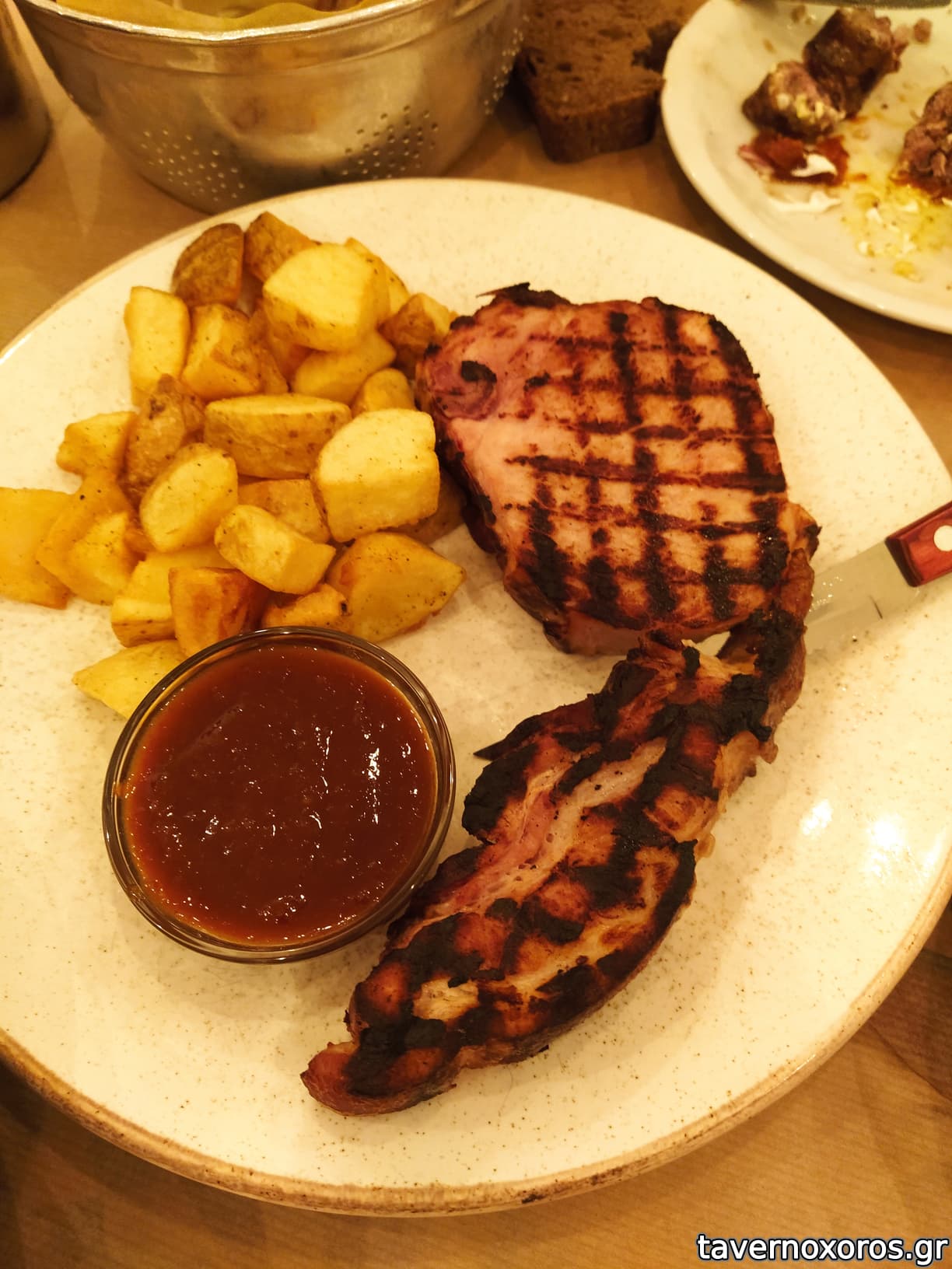 Χοιρινή καπνιστή μπριζόλα με σάλτσα καπνιστής πάπρικας και πατάτες (νόστιμη μεν, αρκετά στεγνή δε)