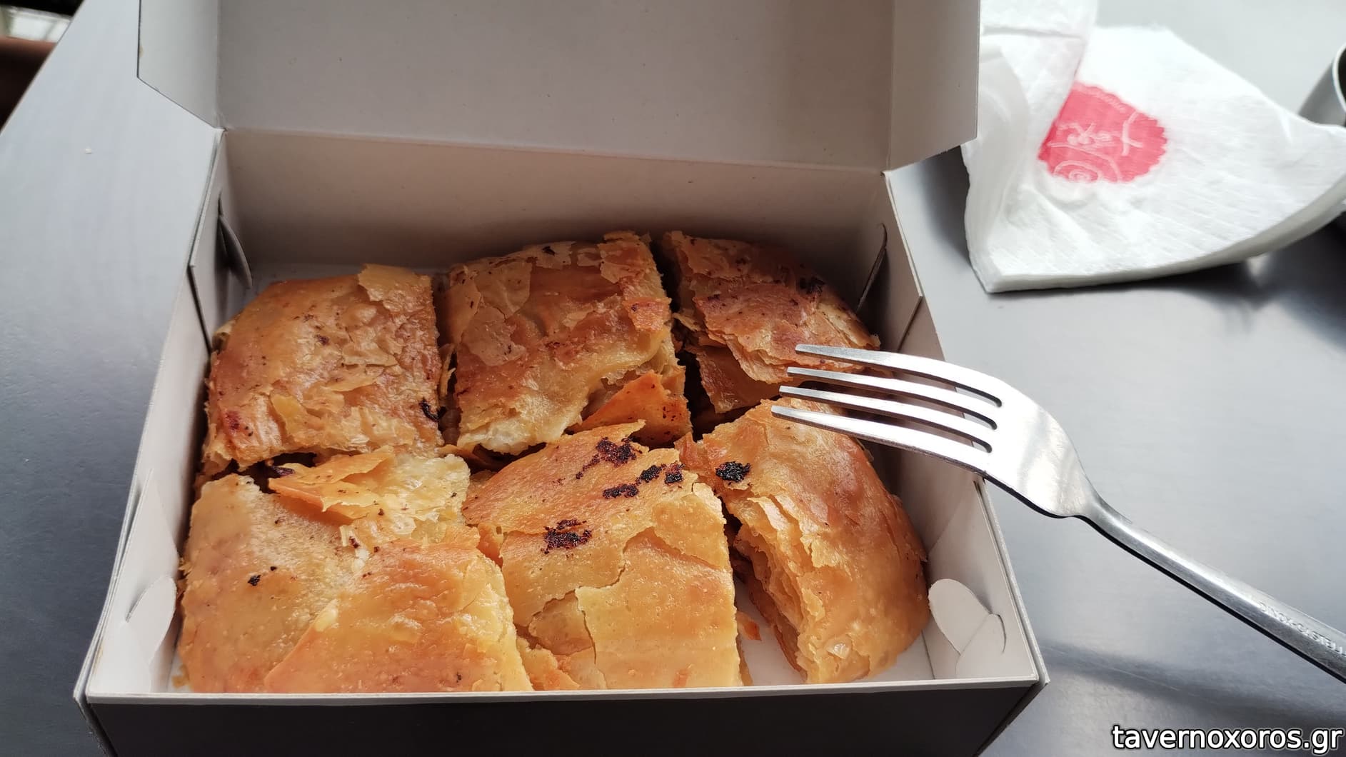 Μπουγάτσα κιμά μού την έβαλε σε κουτί, ενώ τόνισα ότι θα καθίσω, αλλά ευτυχώς μού έδωσε μεταλλικό πιρούνι. Μερίδα μάλλον σμικρυμένη, αλλά με πολύ καλό ντούρο φύλλο και μέσα λάδι πάπρικας (η γέμιση βάφηκε πορτοκαλί!). Καλή, μού άρεσε. Τιμή σμικρυμένη επίσης, 2ε.