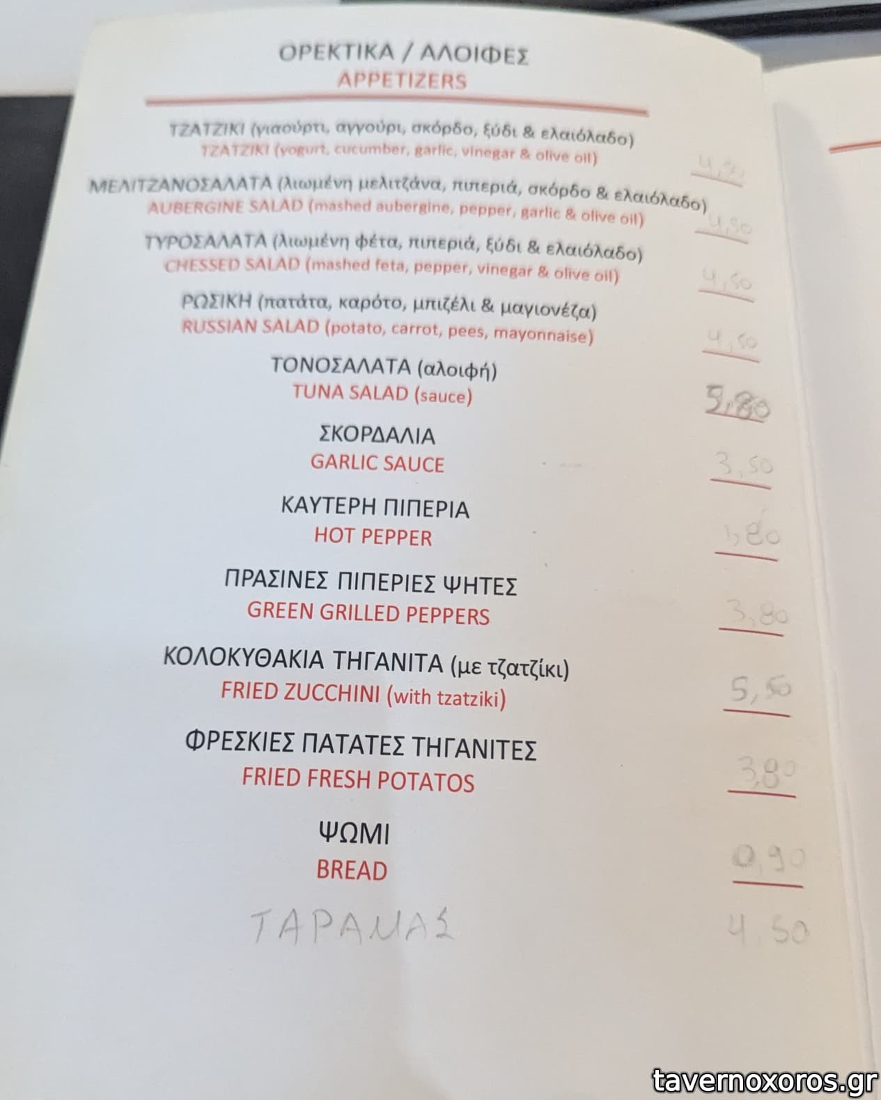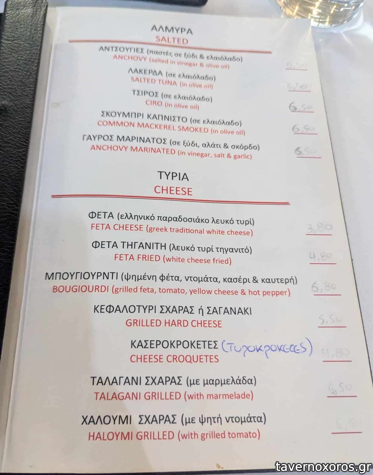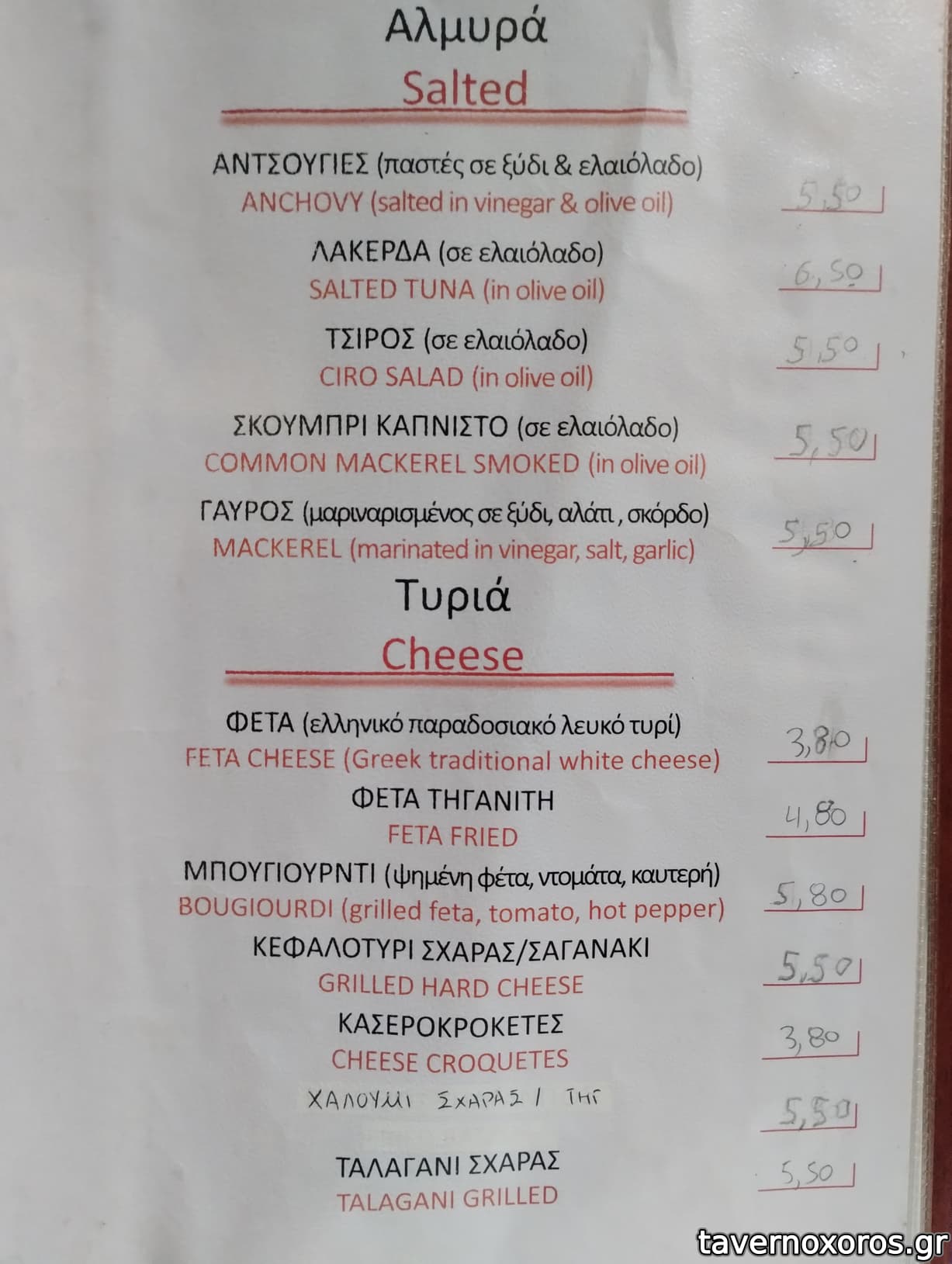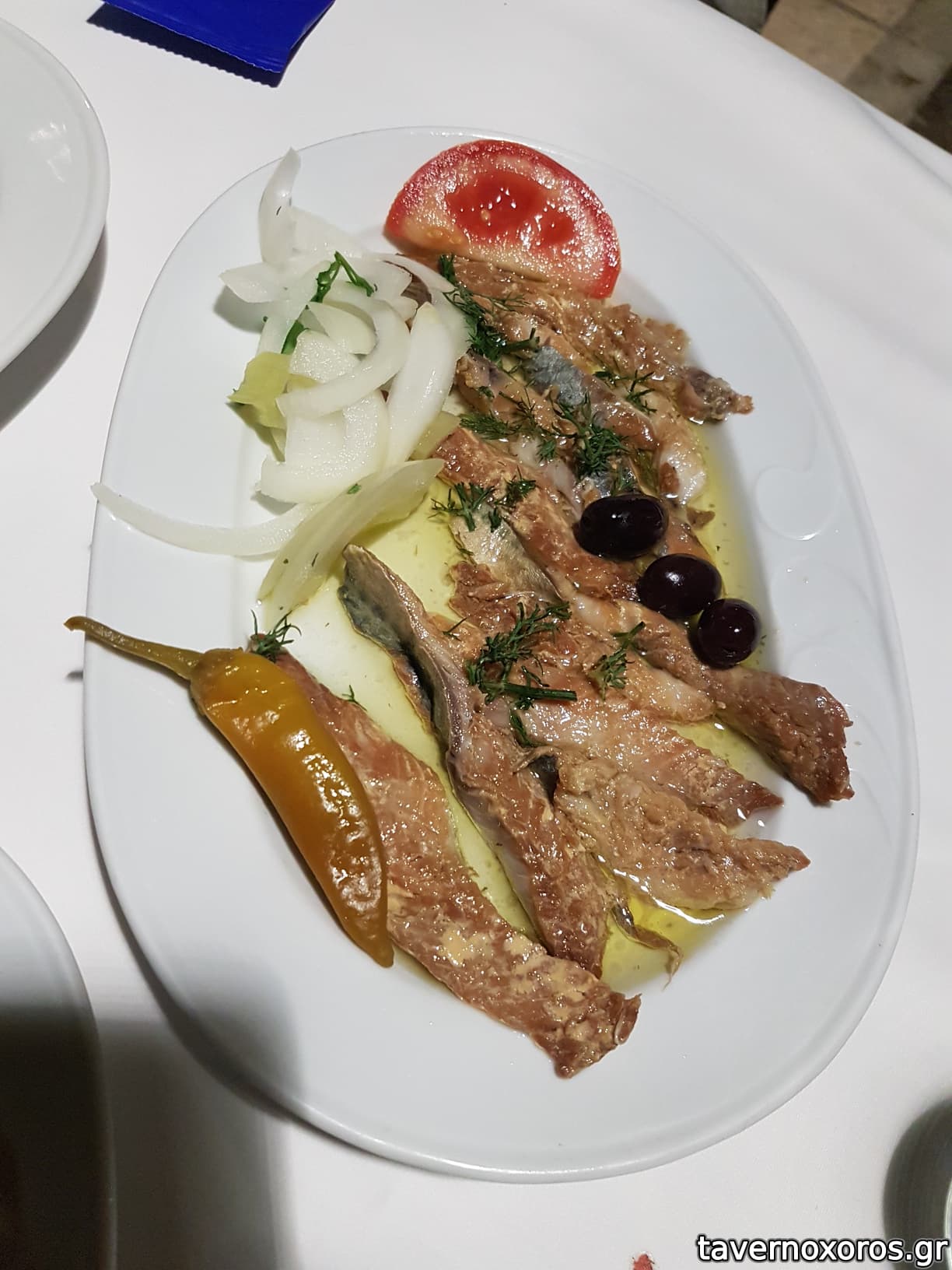 Παραγγείλαμε σκουμπρί καπνιστό (οκ), ταραμά λευκό (κακός), χαλούμι σχάρας (καλό), χωριάτικη (οκ), γαύρο τηγανητό (καλός), σαρφίδια τηγανητά (καλά), καλαμάρι φρέσκο ψητό (καλό) και γαλέο σαγανάκι (αδιάφορος). Αυτά με ψωμί, 2 εμφιαλωμένα τσίπουρα, μια μπύρα και 2 νερά, σύνολο 88€.