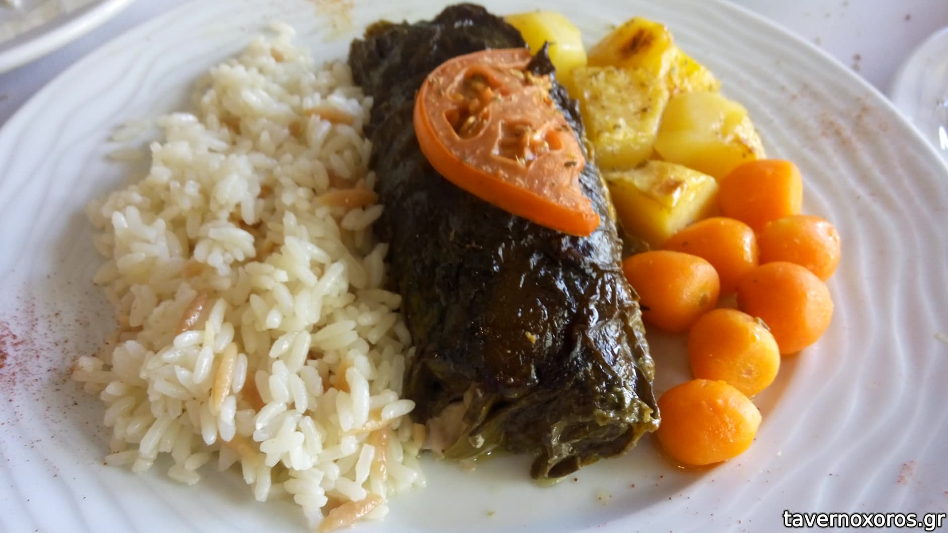 Εἶναι ἀμπελόφυλλα πού τυλίγουν κοτόπουλο καί ζαμπόν καί ἴσως λίγο μπέϊκον. Νόστιμο καί τρυφερό. Καί ἡ γαρνιτούρα καλή.