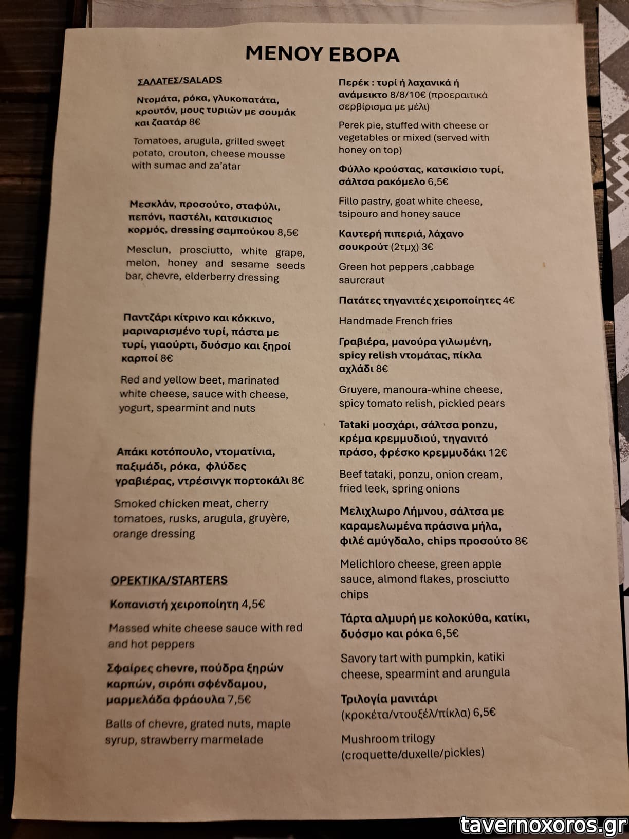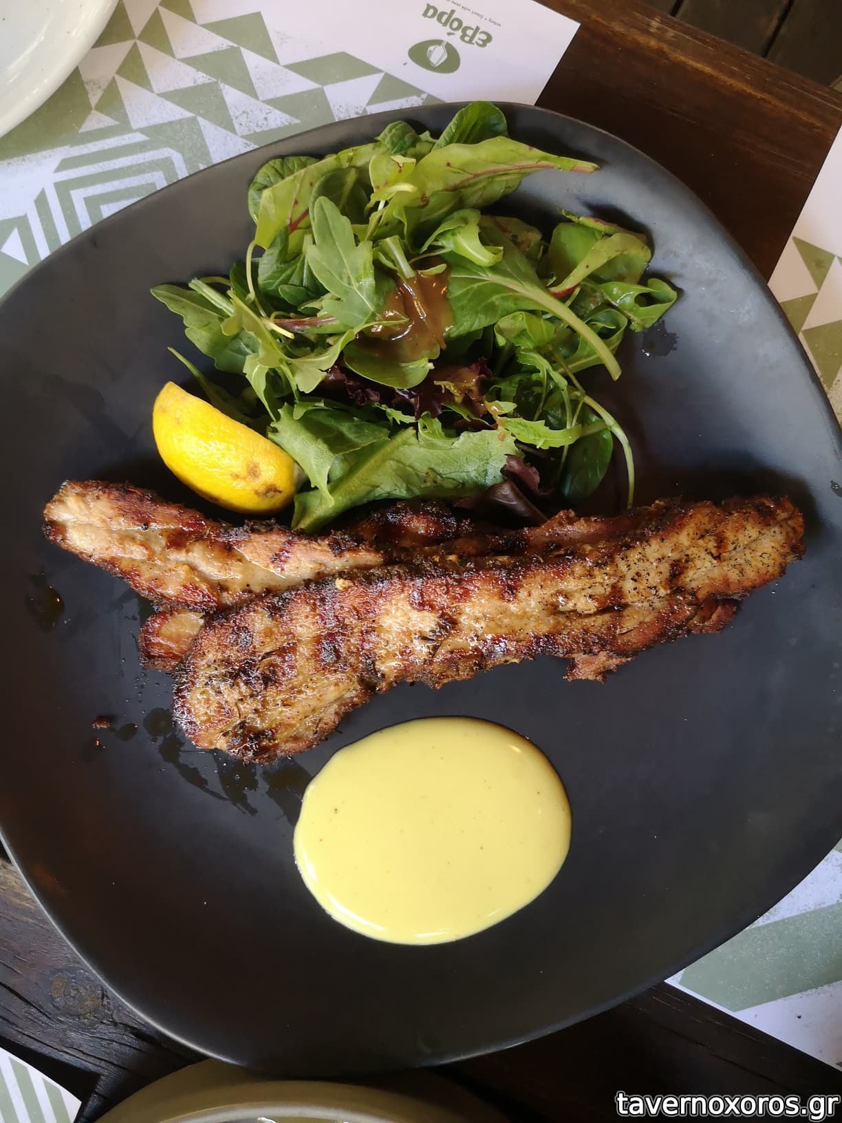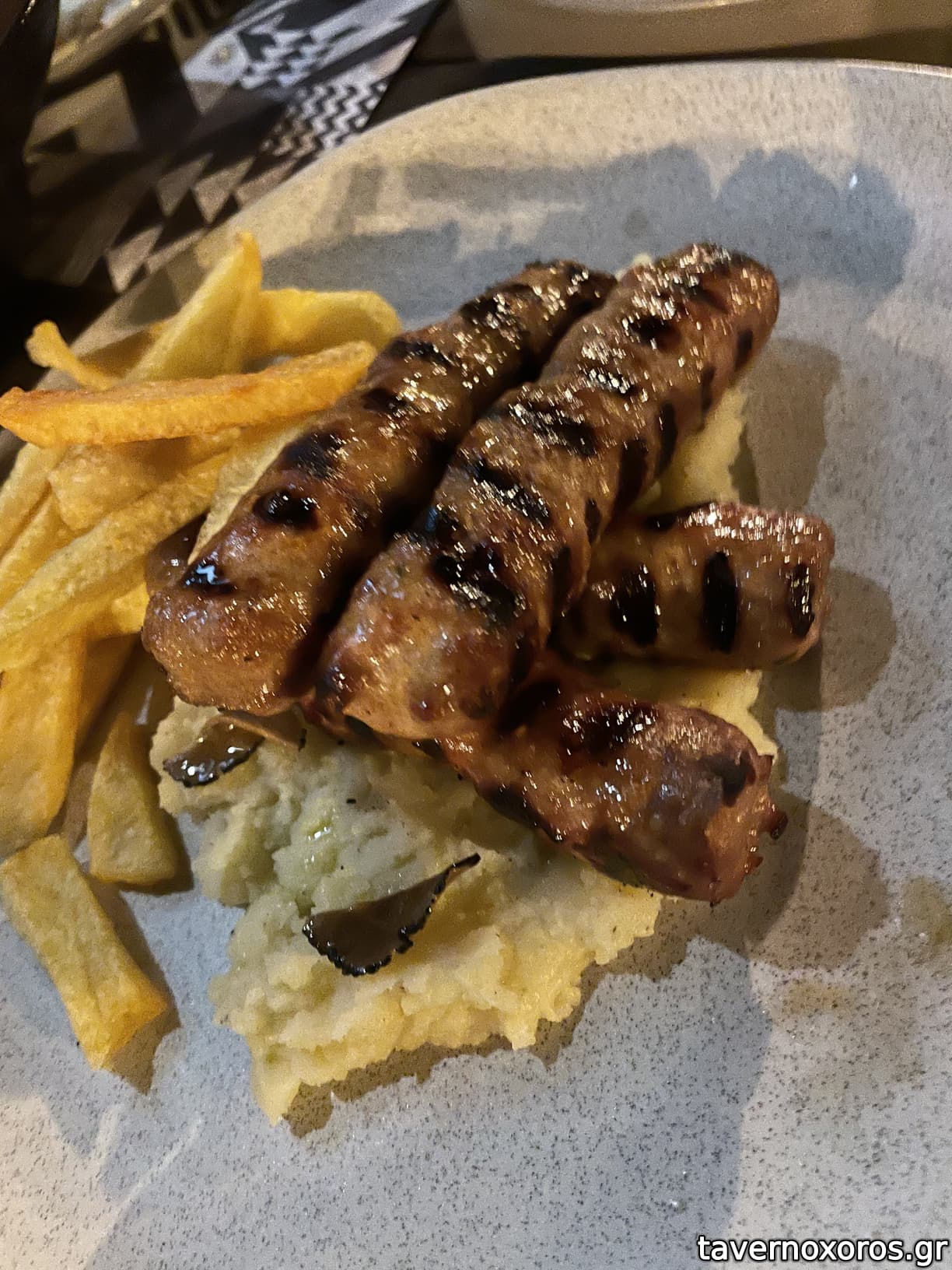 Μάντζα Νάουσας (γενναία μερίδα, πολύ νόστιμο, σαν μπουγιουρντί με λαχανικά), σαλάτα με φρέσκο/μη-βρασμένο παντζάρι (ενδιαφέρον, νόστιμο), παστουρμαδόπιτα (γενναία μερίδα, πολύ λαδερή για μένα, το έτερον ήμισυ ξετρελάθηκε), σουτζουκάκια βουβαλίσια πολύ καλά και ζουμερά.