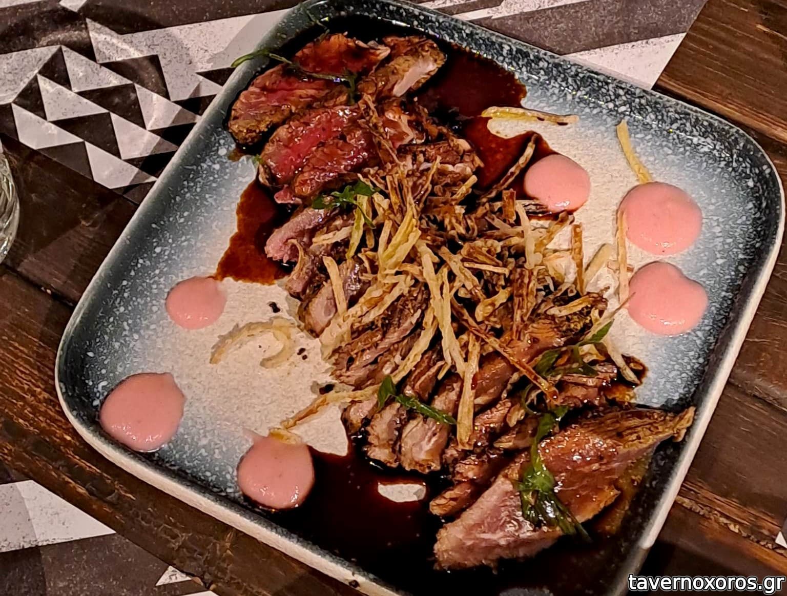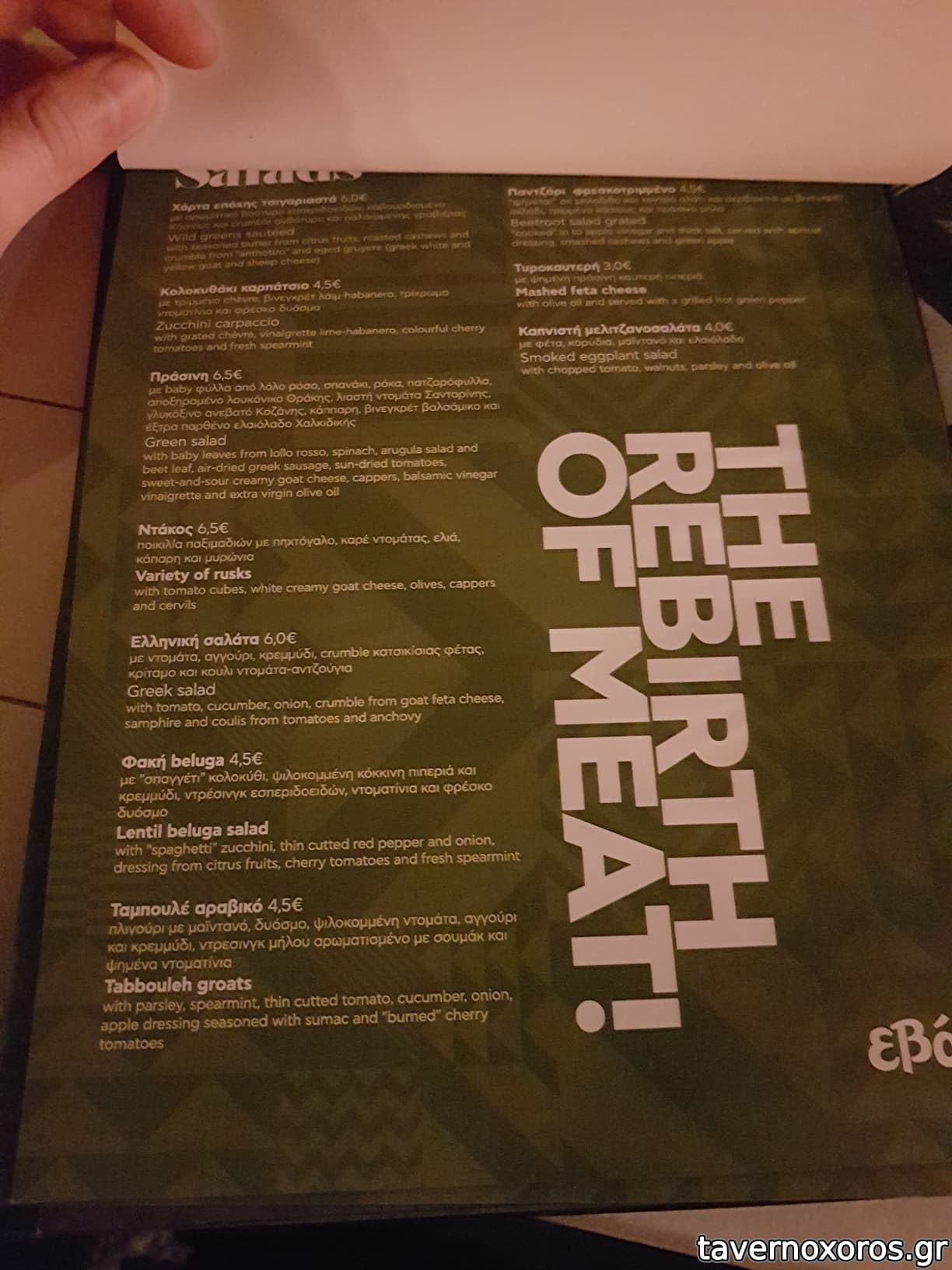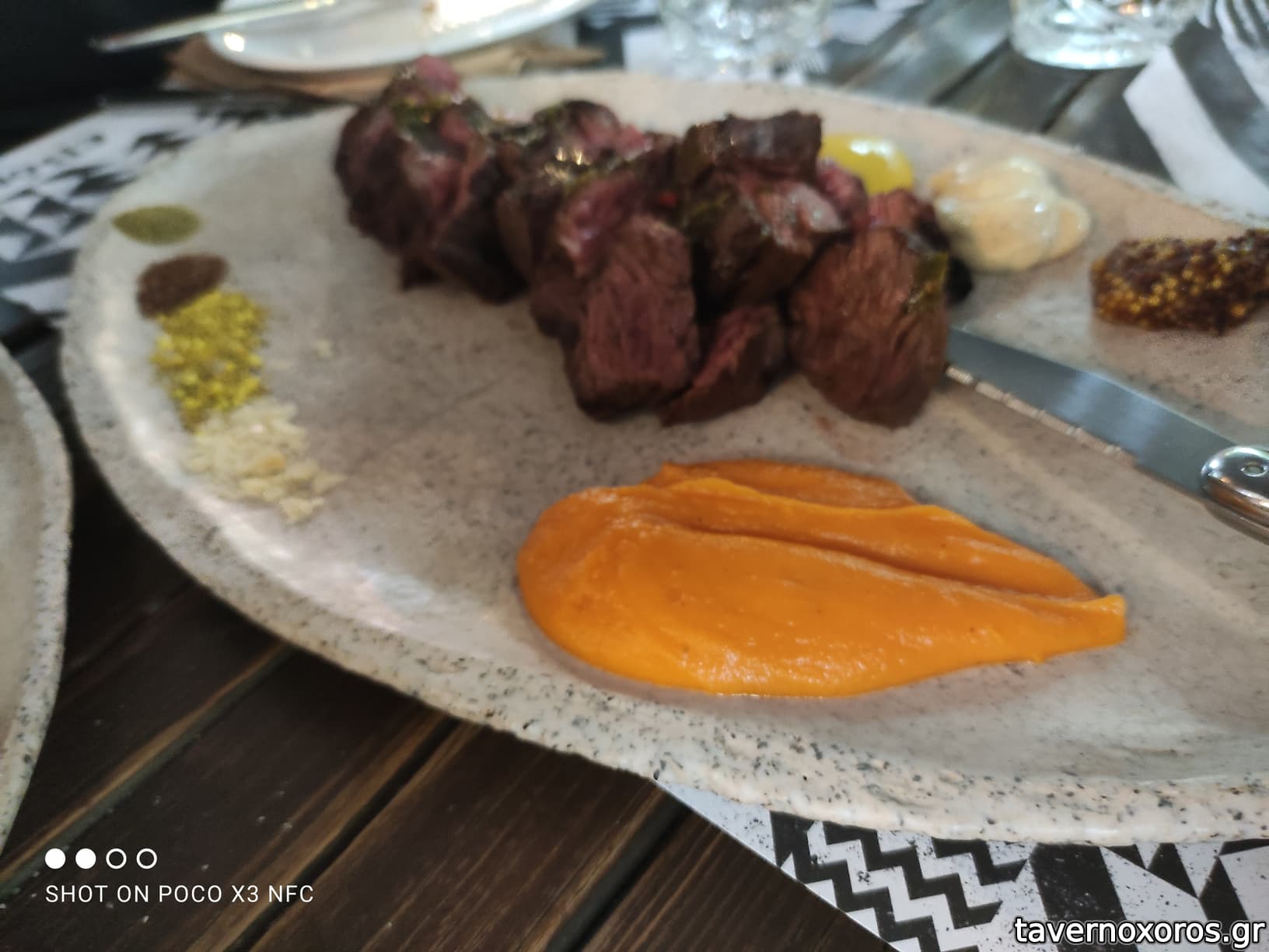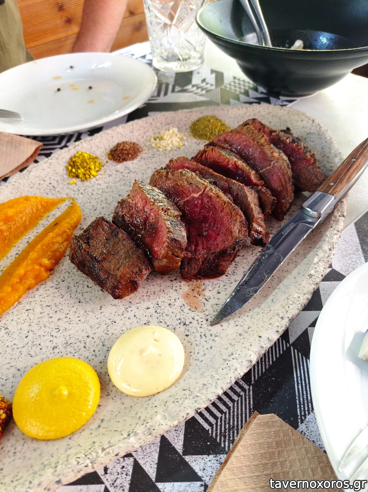 Σαλάτα με φακή μπελούγκα πολύ καλή, τατακι μόσχου από tri-tip black angus δεν ξετρελαθήκαμε αλλά αποδεκτό, πατάτες χεράτες χοντροκομμένες καλές, περέκ με φέτα πολύ καλό και μισόκιλη flat iron steak εξαιρετική.