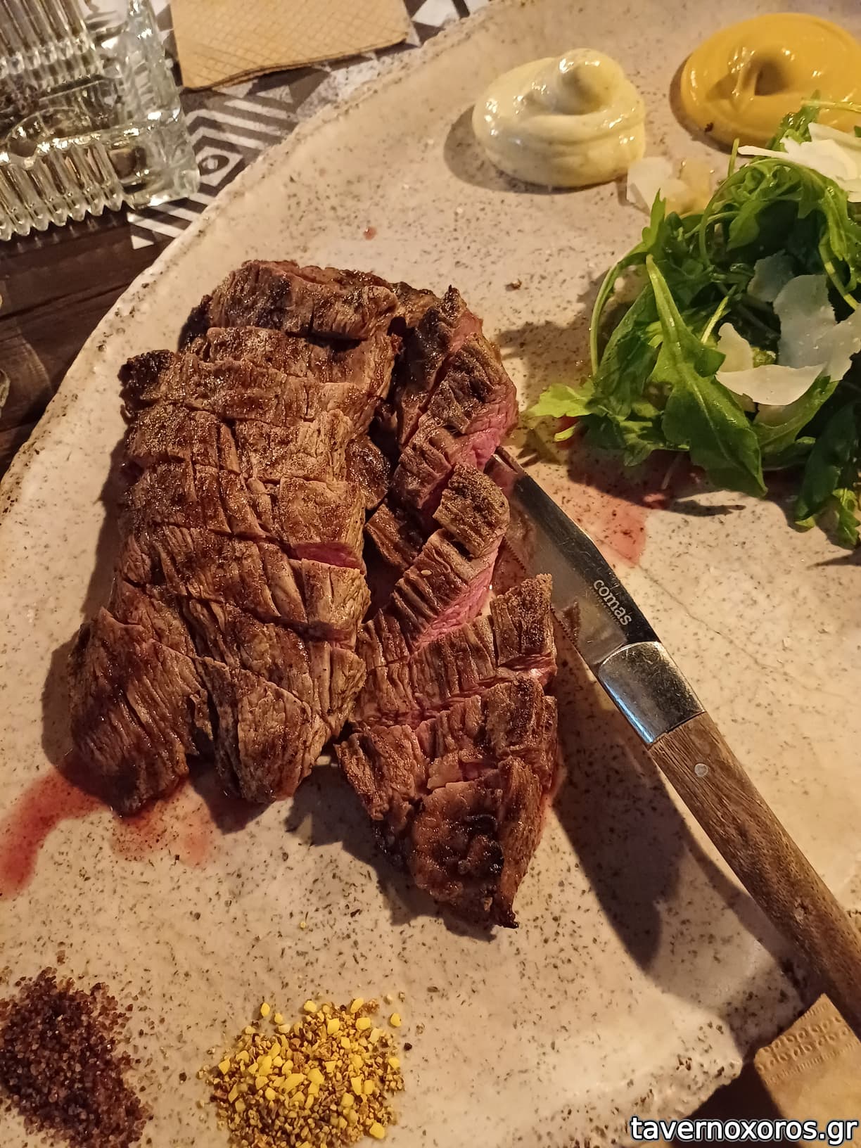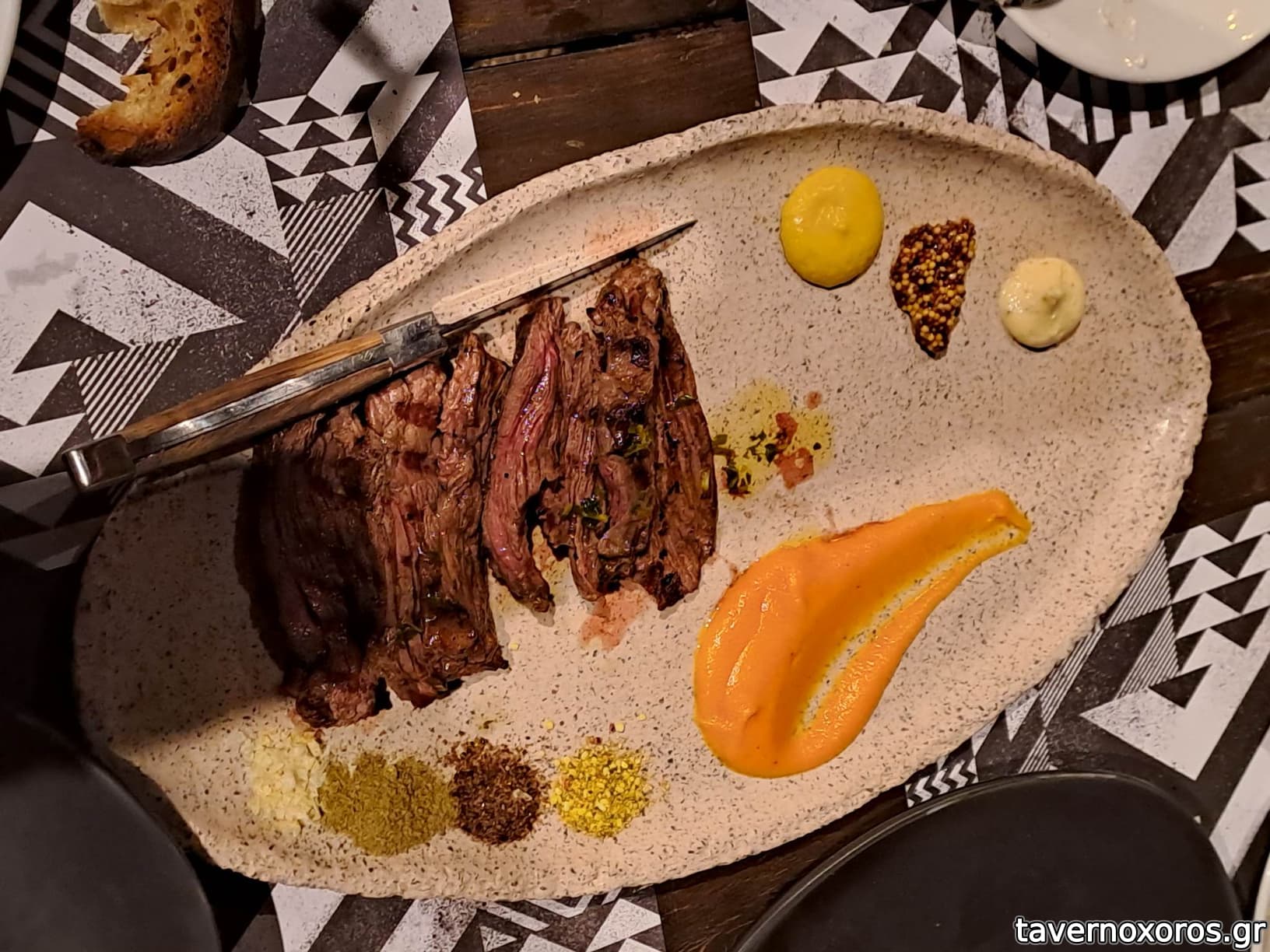 Hanger steak - λουκούμι, ίσως την ήθελα ελαφρώς λιγότερο ψημένη, τα συνοδευτικά της μια χαρά