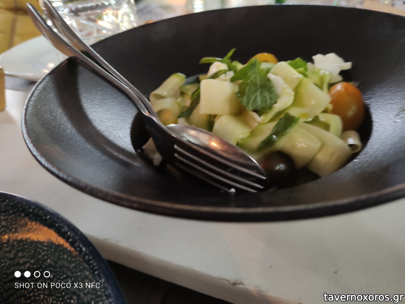 - Μάντζα Νάουσας (σοταρισμένα κομμάτια από ψιλοκομμένη μελιτζάνα, κολοκυθάκι, πιπεριές με λίγο γραβιέρα). Αδιάφορη, θύμιζε μπριάμ.