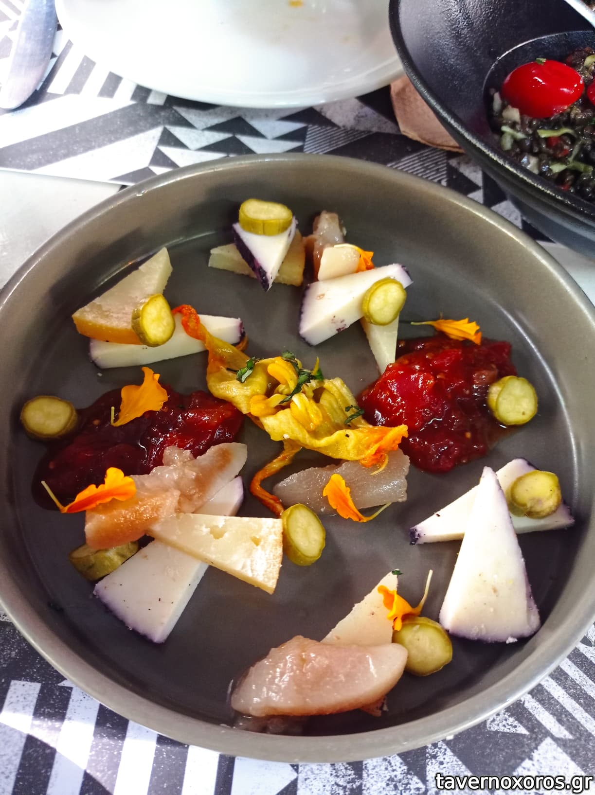 Γραβιέρα και μανούβρα Σίφνου (τα τυριά πολύ μέτρια, τα υπόλοιπα στοιχεία του πιάτου πολύ ενδιαφέροντα)