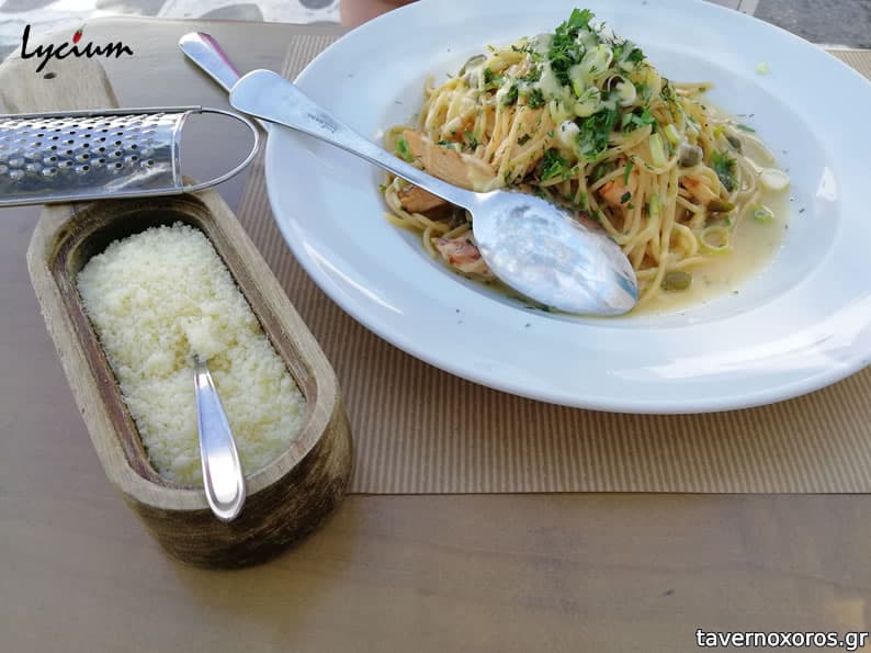 Fitness pasta con pollo (14€) σπαγγέτι ολικής με φρέσκο κοτόπουλο σε βινεγκρέτ λεμονιού, κάπαρη, σκόρδο, κρεμμύδι και άνηθο, εξαιρετική!