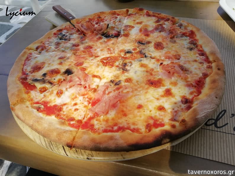 Prosciutto cotto (11€) πίτσα σάλτσα ντομάτας, μοτσαρέλα, prosciutto cotto και φρέσκα μανιτάρια, πάρα πολύ καλή.