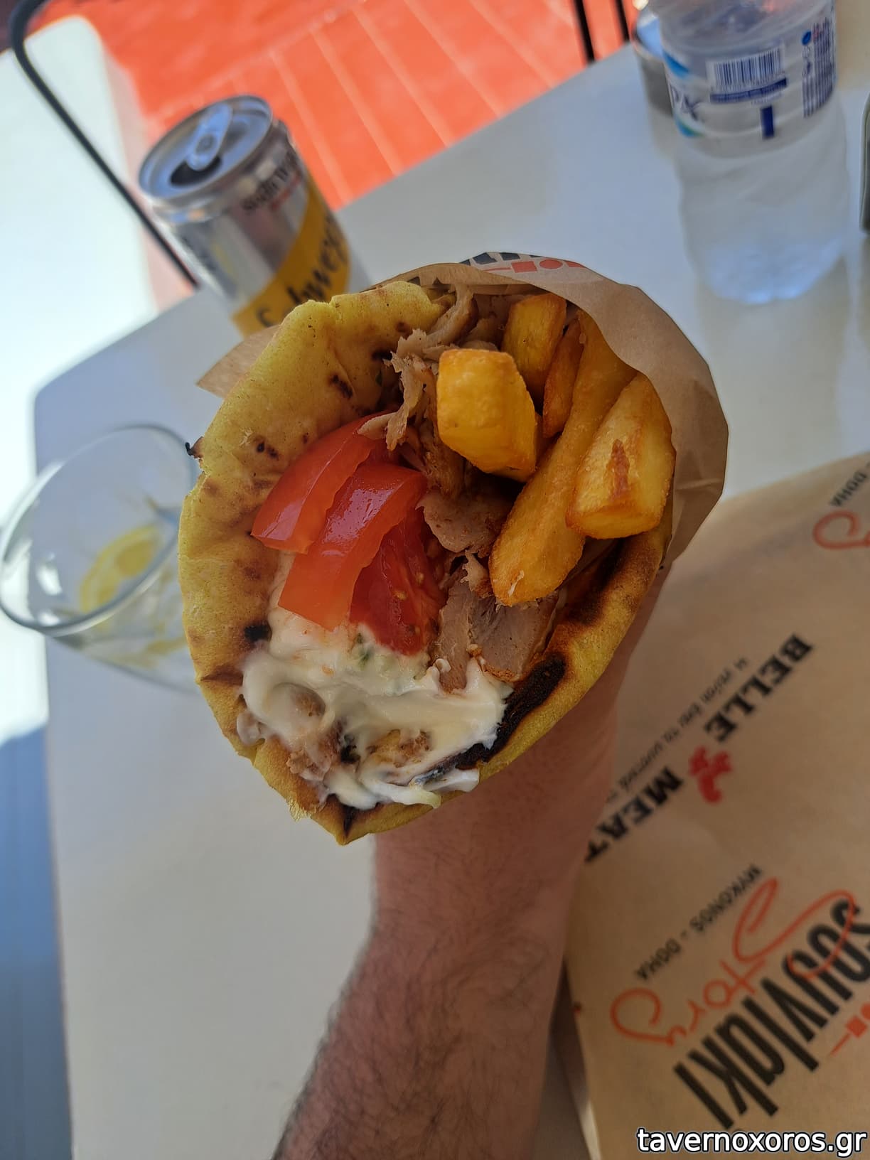 Στον κατάλογο που φέρανε είχε όλα τα πιάτα και τις μερίδες που κοστιζουν μισό νεφρό αλλά δεν είχε τα απλά σαντουιτς. Η πίτα με γύρο είναι εκτός καταλόγου, πρέπει να ρωτήσεις. Only in Mykonos.