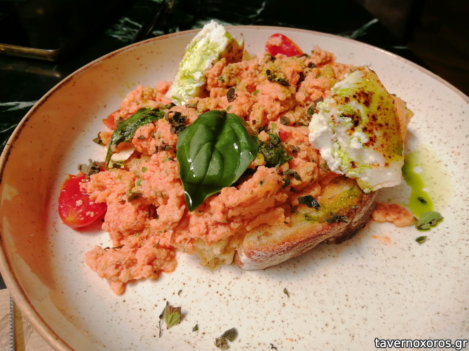 Strapazzale αυγά με ντομάτα φρέσκια και κατσικίσιο τυρί (χάλια, το ψωμί ήταν μπαγιάτικο και παπαριασμένο)