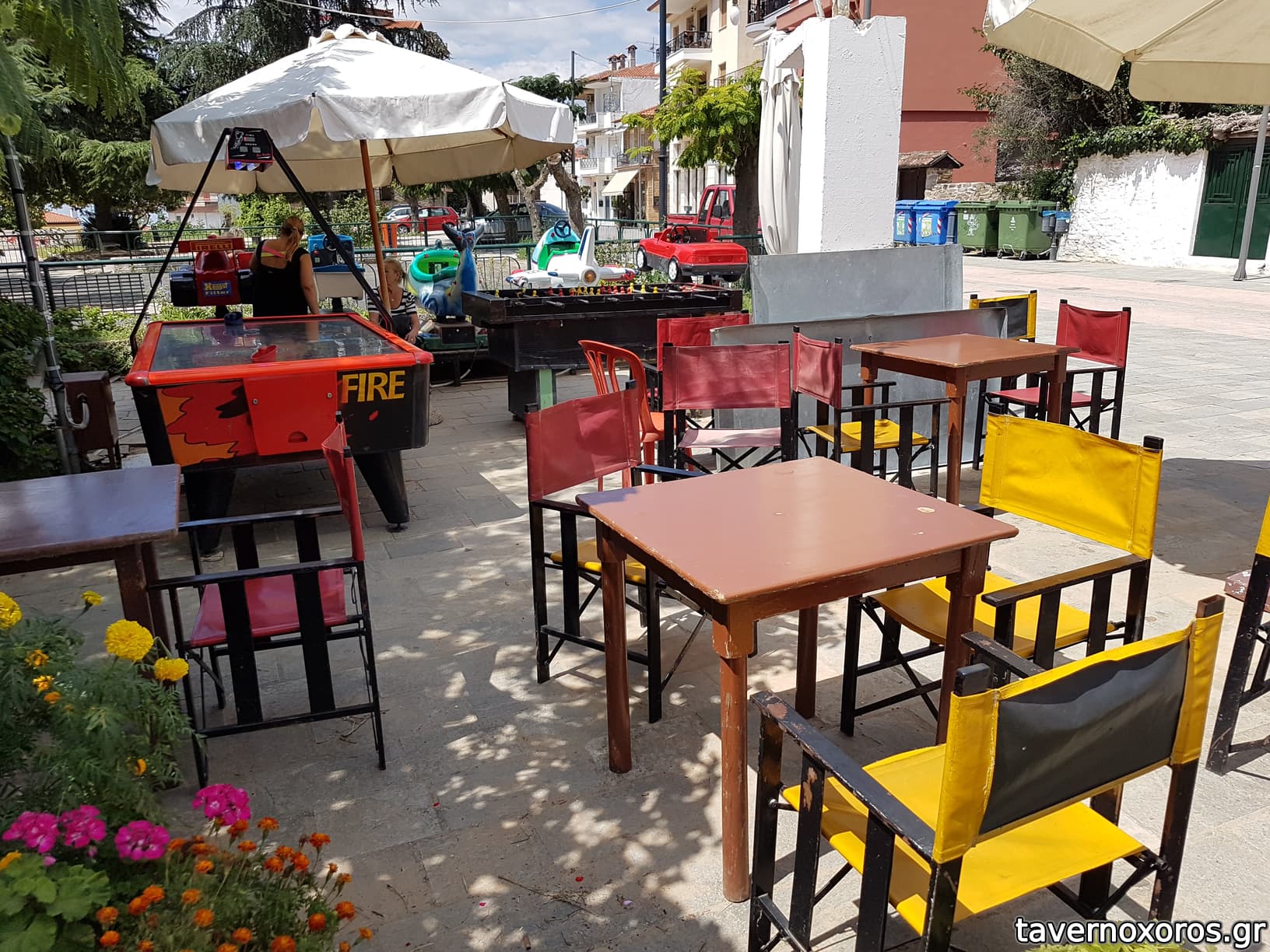 Το καλοκαίρι βγάζει μπροστά στην πλατεία υπαίθρια παιχνίδια (αλογάκια, air hockey, κτλ).