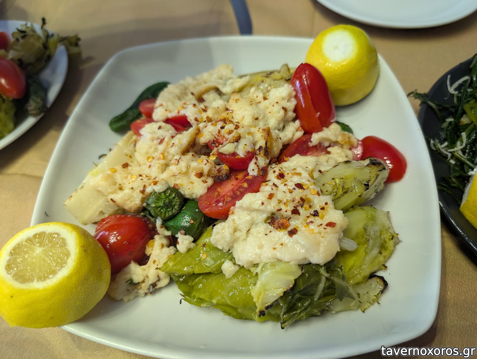 Σαλάτα φασόλια, λάχανο ψητό, χόρτα (πολύ καλή)