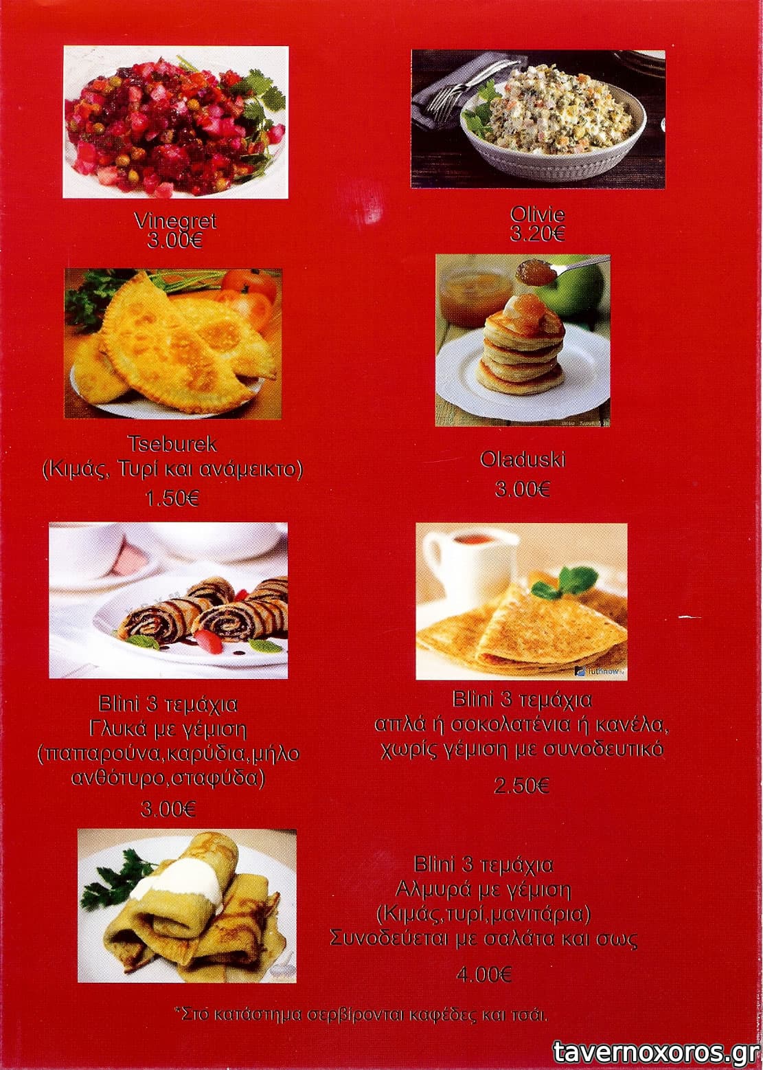 Περίεργη μίξη ρώσικου εστιατορίου με αισθητική ελληνικής καφετέριας. Δοκιμάστηκαν πελμένι και βαρένικι (με κιμά, τυρί και πατάτα) και μπλινί με μανιτάρια, όλα νόστιμα (ίσως ελαφρώς καλύτερα από τα αντίστοιχα της Σιβηρίας Πελμένι). Δυστυχώς δεν υπήρχε μοσχαράκι στρογκάνοφ εκείνη τη μέρα, οπότε δοκιμάστηκαν αντ' αυτού τα γεμιστά κεφτεδάκια με τυρί --συμπαθητικά, όχι κάτι το ιδιαίτερο. Τα φαγητά ετοιμάζονται επί τόπου από την ιδιοκτήτρια, ενώ κάπου πήρε το μάτι μου πως μπορείς να παραγγείλεις κατεψυγμένα ωμά πελμένι για το σπίτι. Τιμές πολύ καλές. Το προτείνω, αλλά με έναν μικρό αστερίσκο λόγω της σχετικά άβολης ατμόσφαιρας (μπορεί να έτυχε και η μέρα...).