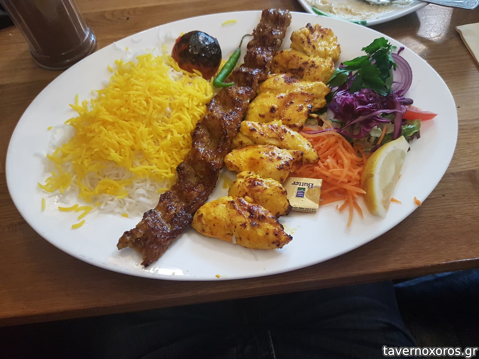 26' για τους μυημένους). Κοτόπουλο και αρνί με σαφρόν ρύζι και σαλάτα