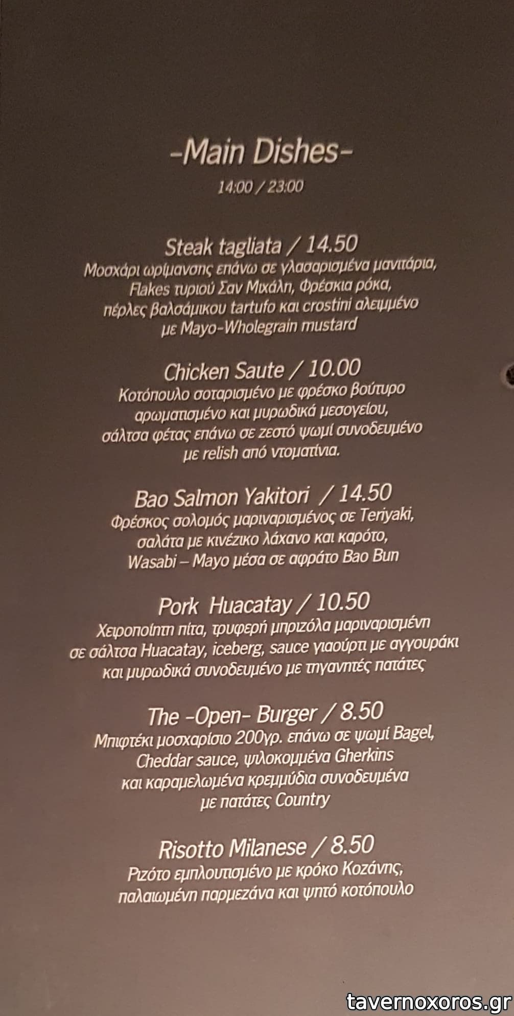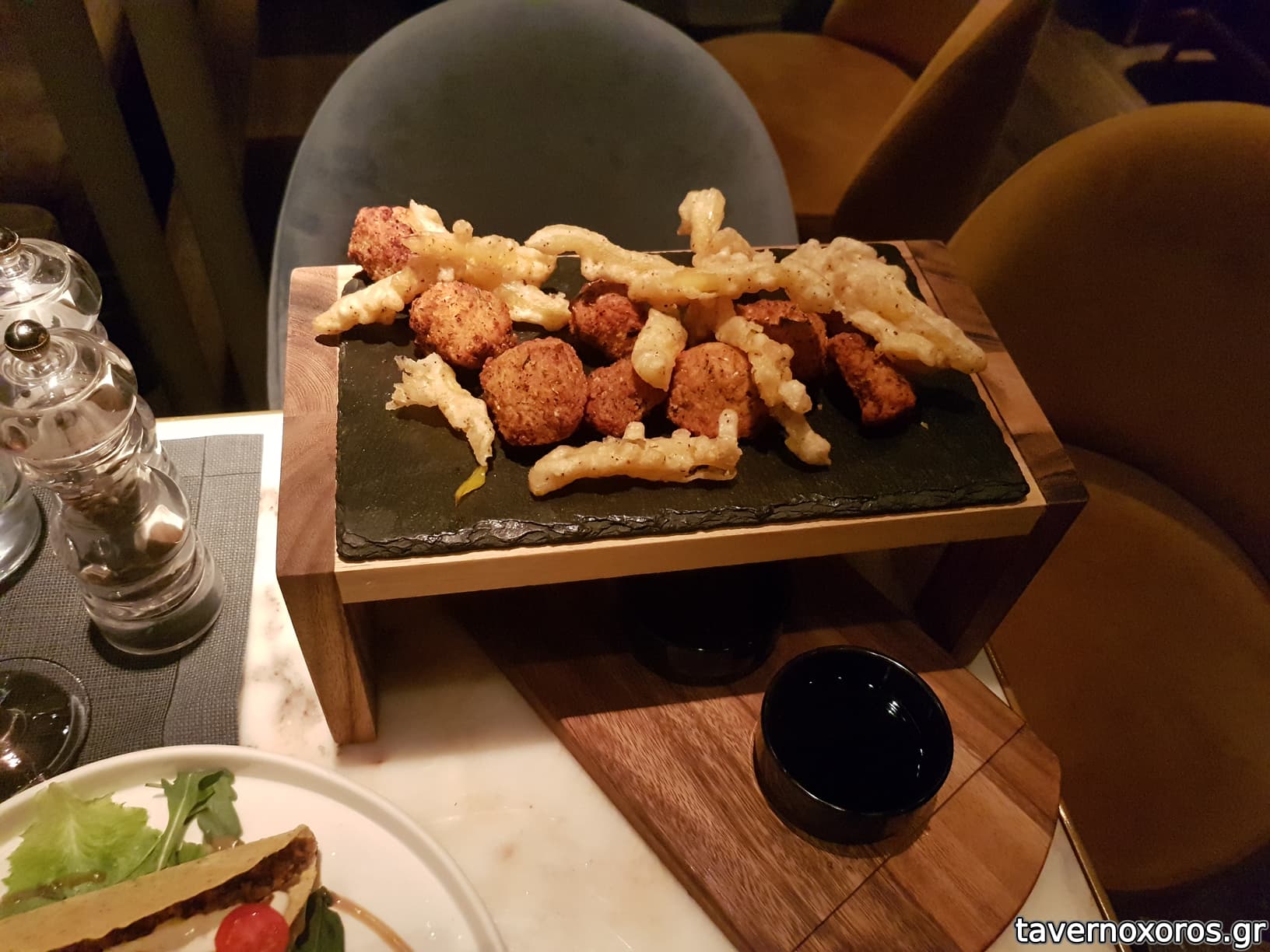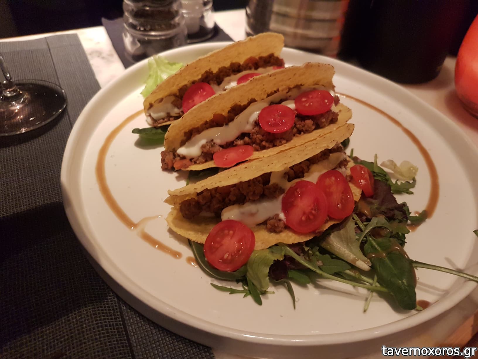 "Crispy tacos γεμισμένα με μοσχάρι μαγειρεμένο σε adobo, sauce γιαουρτιού, φρέσκο κόλιανδρο και ντοματίνια"