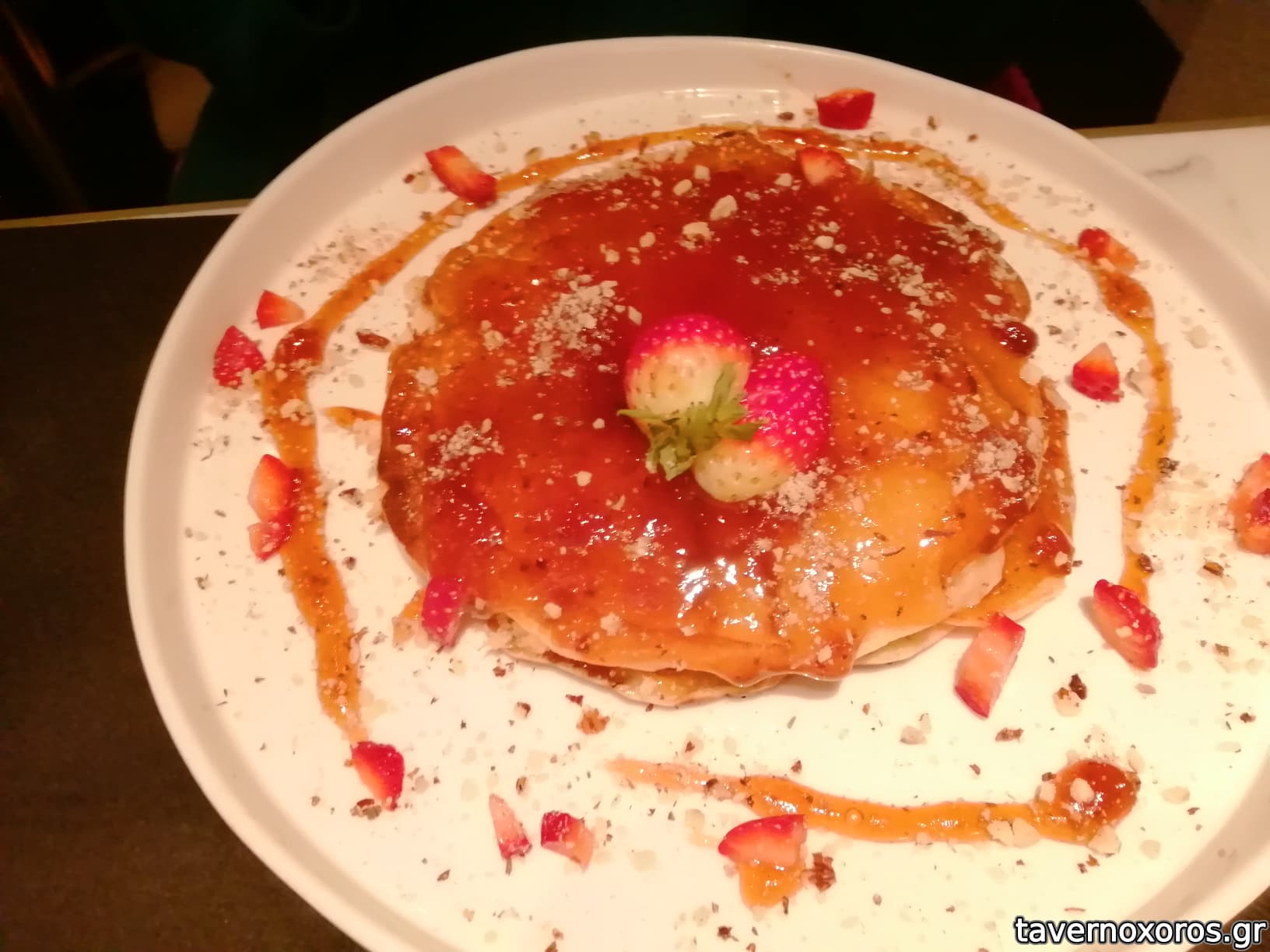 Pancakes με μαρμελάδα φρούτων του δάσους και τριμμένα αμύγδαλα (ζητήθηκαν χωρίς την στάνταρ άσπρη σοκολάτα)