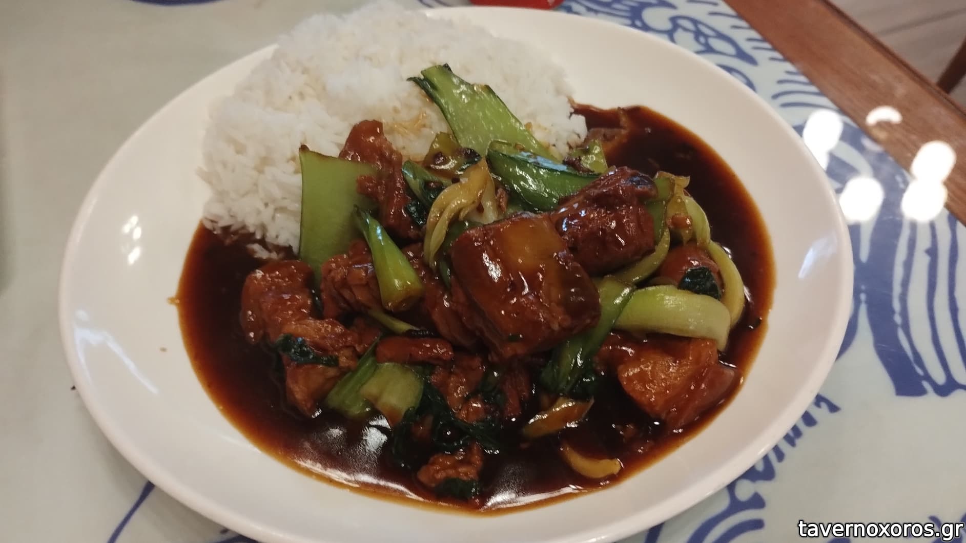 Και όντως είναι όλα όπως πριν: πέρασα για κάτι σε stir-fry και εκείνη τη στιγμή σέρβιραν μια μερίδα Shanghai-Style Braised Pork Belly. Τους ζήτησα από αυτό και μου το ετοίμασαν μια χαρά. Η επιστημονική ονομασία είναι hongshao rou (ρόου). Μαζί έβαλαν και λίγο Napa cabbage και φυσικά, ρύζι. (5ε)