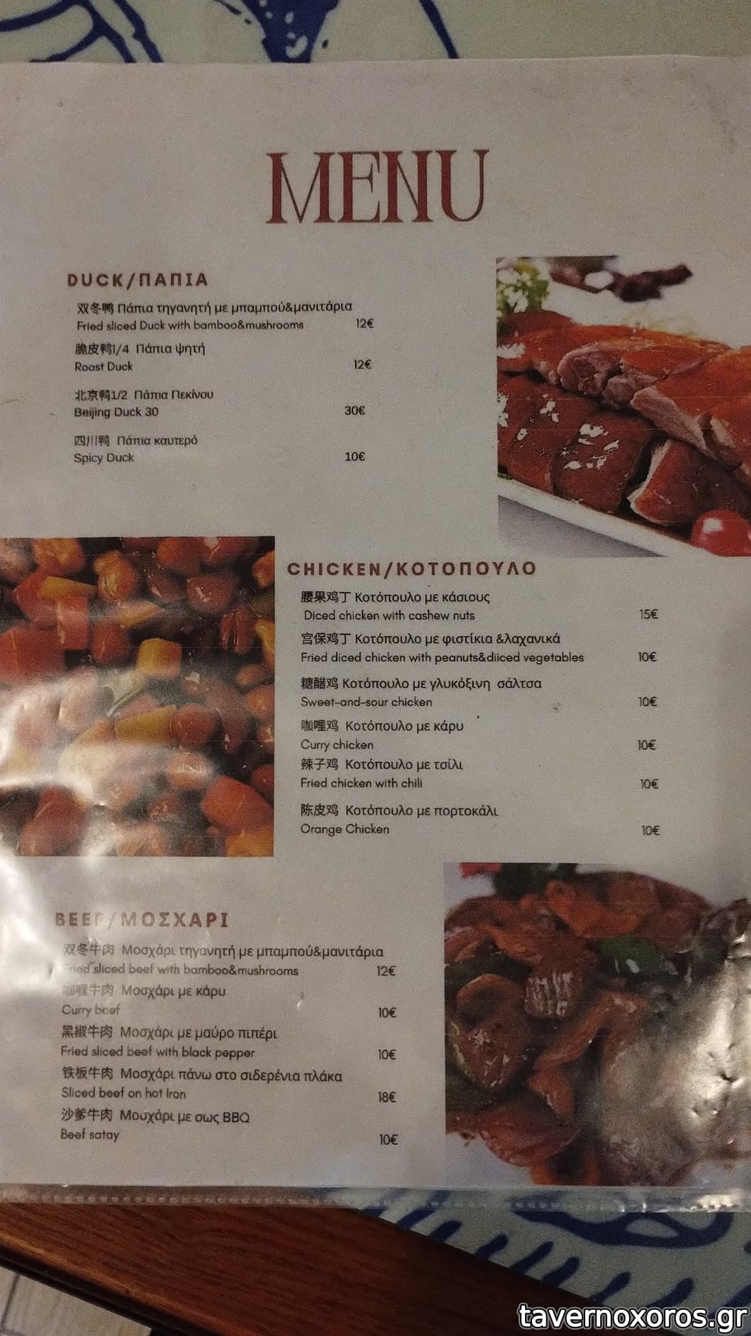Πήραμε μια μερίδα pork belly, μια μερίδα καυτερό τοφου, μια μερίδα black pepper beef. Ένα κινέζικο τσάι με κανέλα και μια κόκα κόλα. 26 ευρώ.