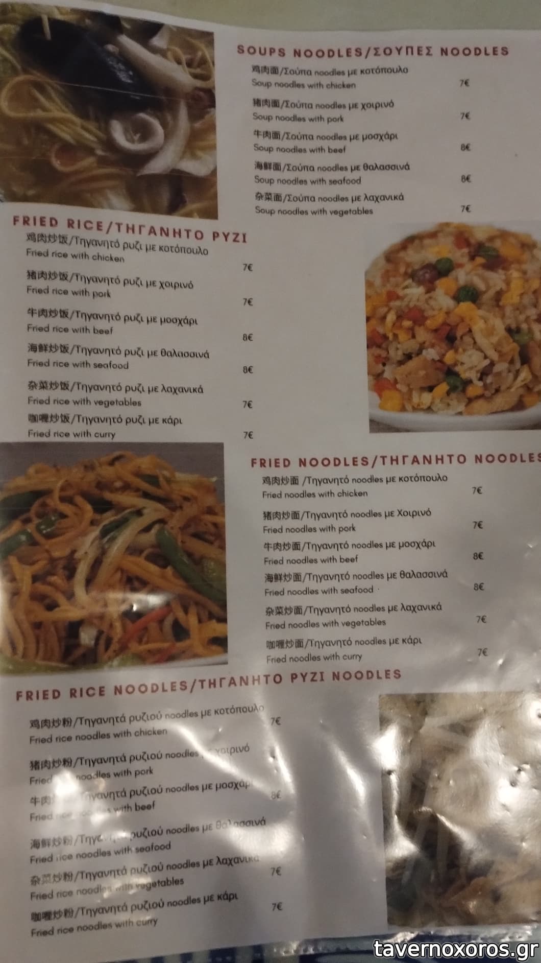 Στα κυρίως: Ρύζι με Κοτόπουλο και Αυγό Κάρυ, και Νουντλς με χοιρινό και λαχανικά. Καλά και τα δυο, μεγάλες μερίδες. Και μεγάλο πιάτο Μοσχάρι με πιπεριές, 15ε, μεγάλη μερίδα. Όλα μεγάλες μερίδες χορταστικές, όλα πολύ νόστιμα και ελαφρά. Ο λογαριασμός βγήκε τόσο γιατί όλα τα άλλα πιάτα κάνουν από 6ε. Μπύρες είχε μόνον ελληνικές.