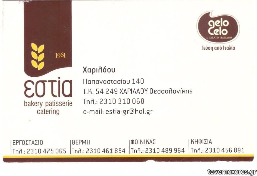 | Λέξεις κλειδιά | Estia, #ψωμί, #πίτες, #κρουασάν, #πεϊνιρλί, #ατομική πίτσα, #τσουρέκι, #παγωτό, #τούρτες, #μαγειρευτά, #γεμιστά, #μουσακάς, #μελιτζάνες |