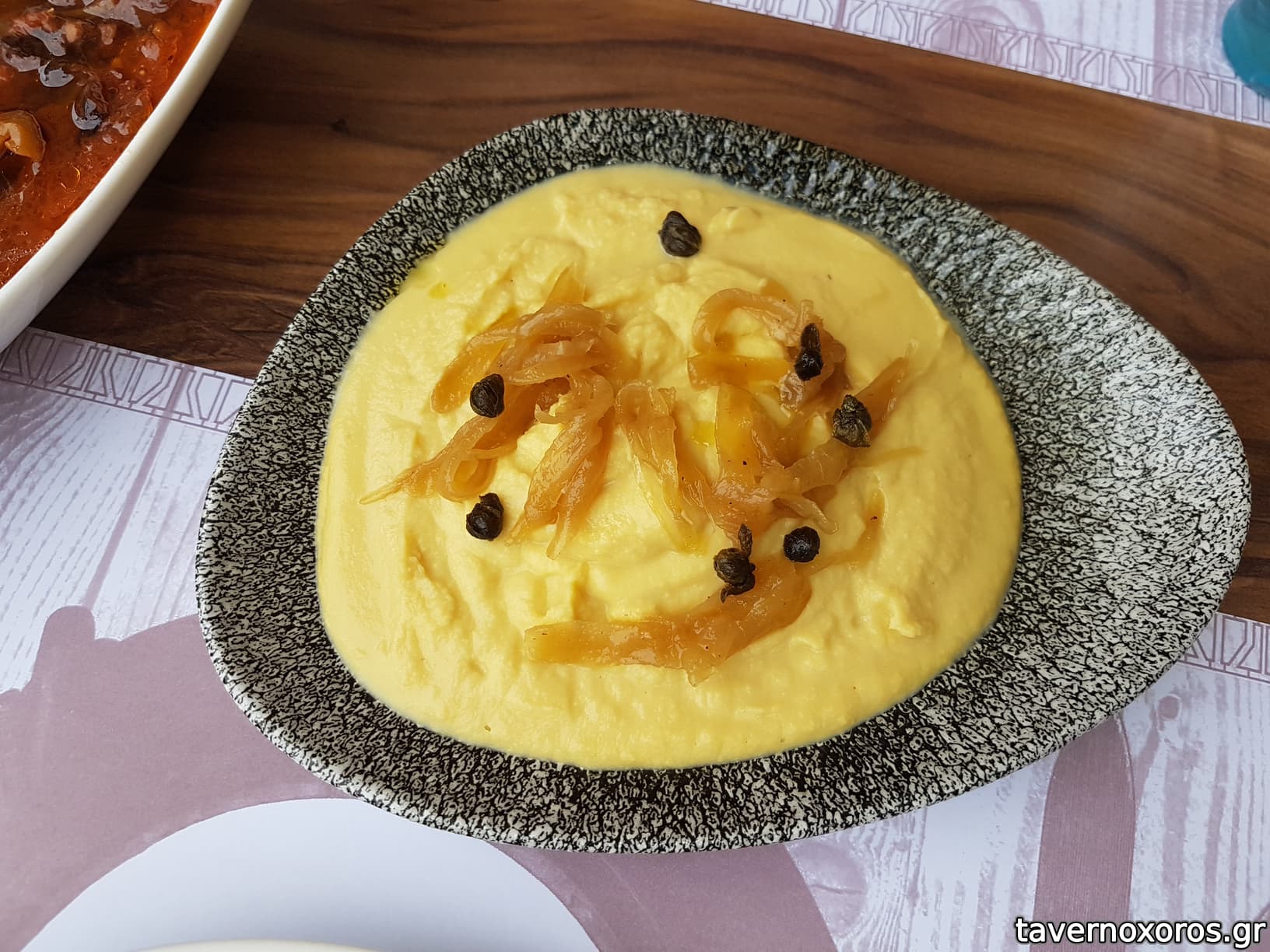"Κίτρινη φάβα με λάδι τρούφας, καραμελωμένα κρεμμύδια και κάπαρη" (απλώς οκ)