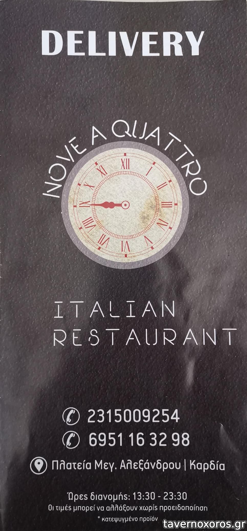 Αν και μικρή σημασία έχει η επωνυμία της επιχείρησης θα έπρεπε να είναι Nove meno un quarto(εννέα παρά τέταρτο). Nove a quattro δεν σημαίνει κάτι,