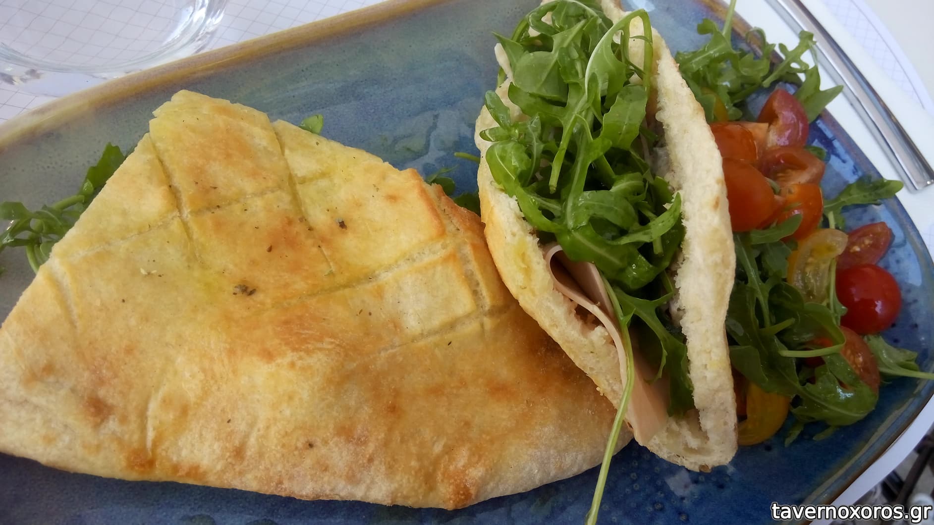 Sandwich με ζεστή focaccia, prosciutto cotto, παρμεζάνα, ρόκα, ντοματίνια, μαγιονέζα μανιταριών (πολύ καλό)