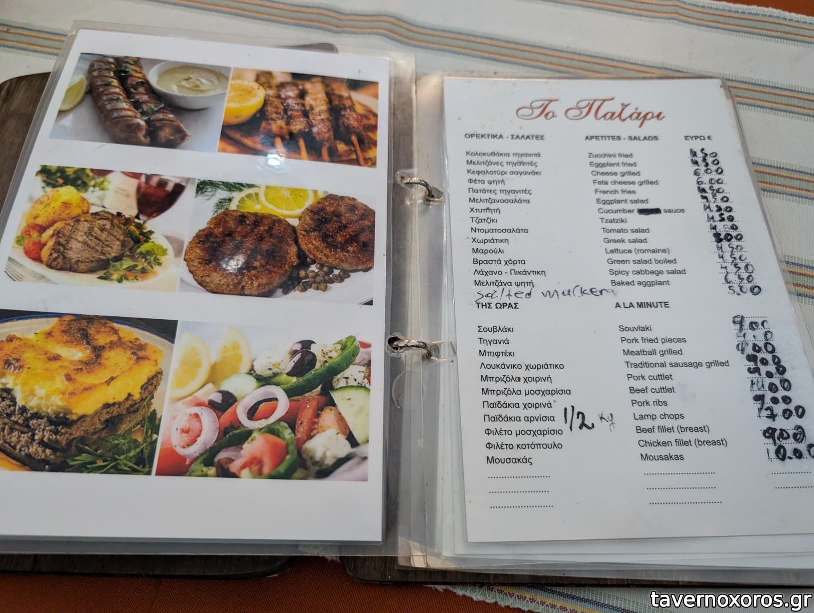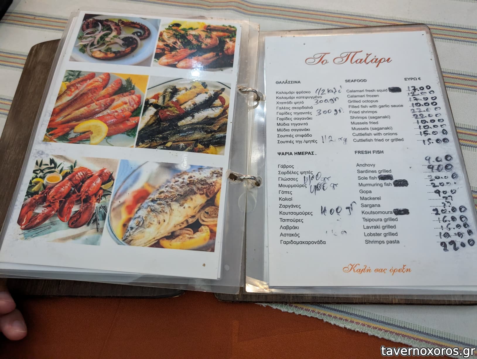 - Κατάλογος με μερικά φρέσκα ψαράκια και κρεατικά.