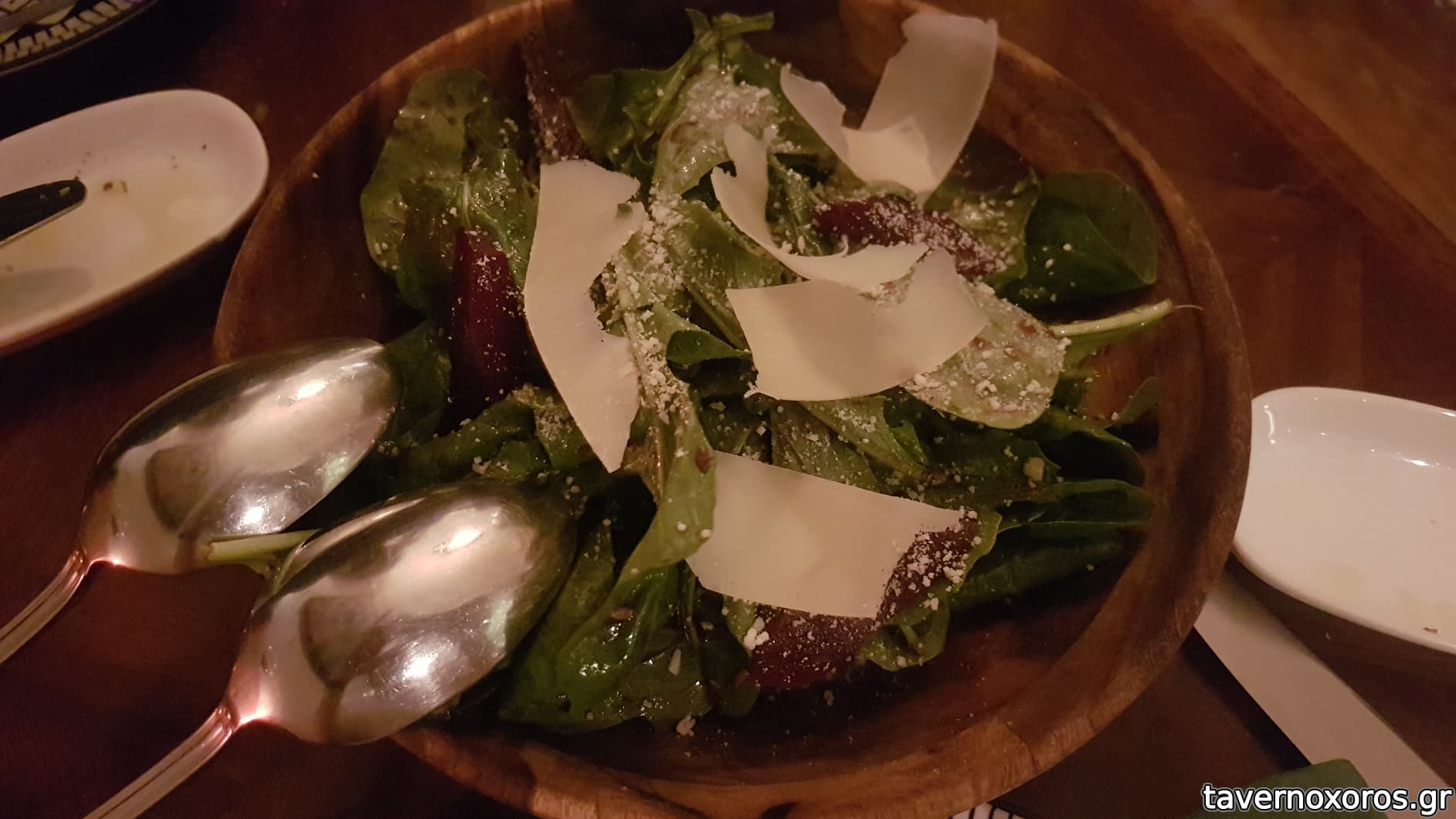 "Green salad with pears cooked in wine, parmezan and balsamic vinegar" (μια χαρά)