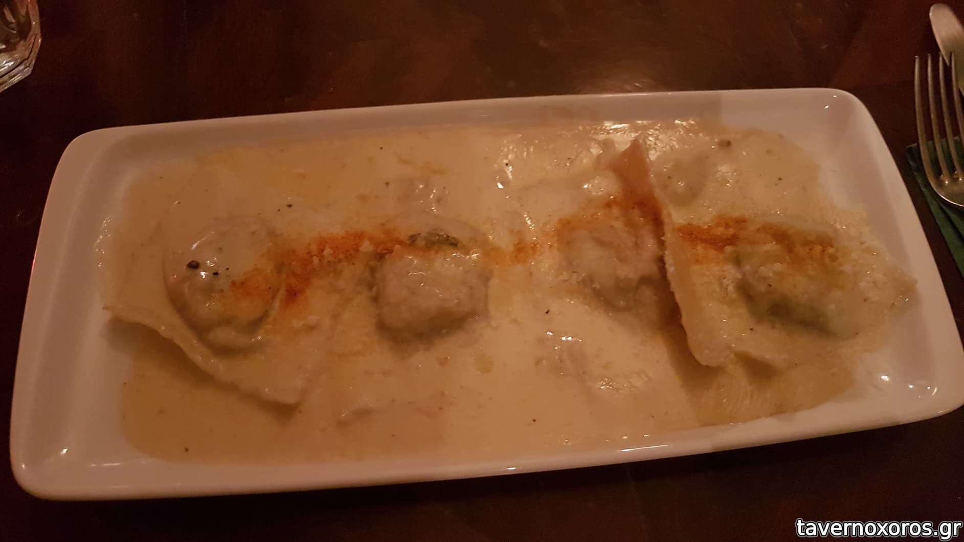 "Ravioli stuffed with duck meat and dried apricots, cream of parmesan" (καλό)