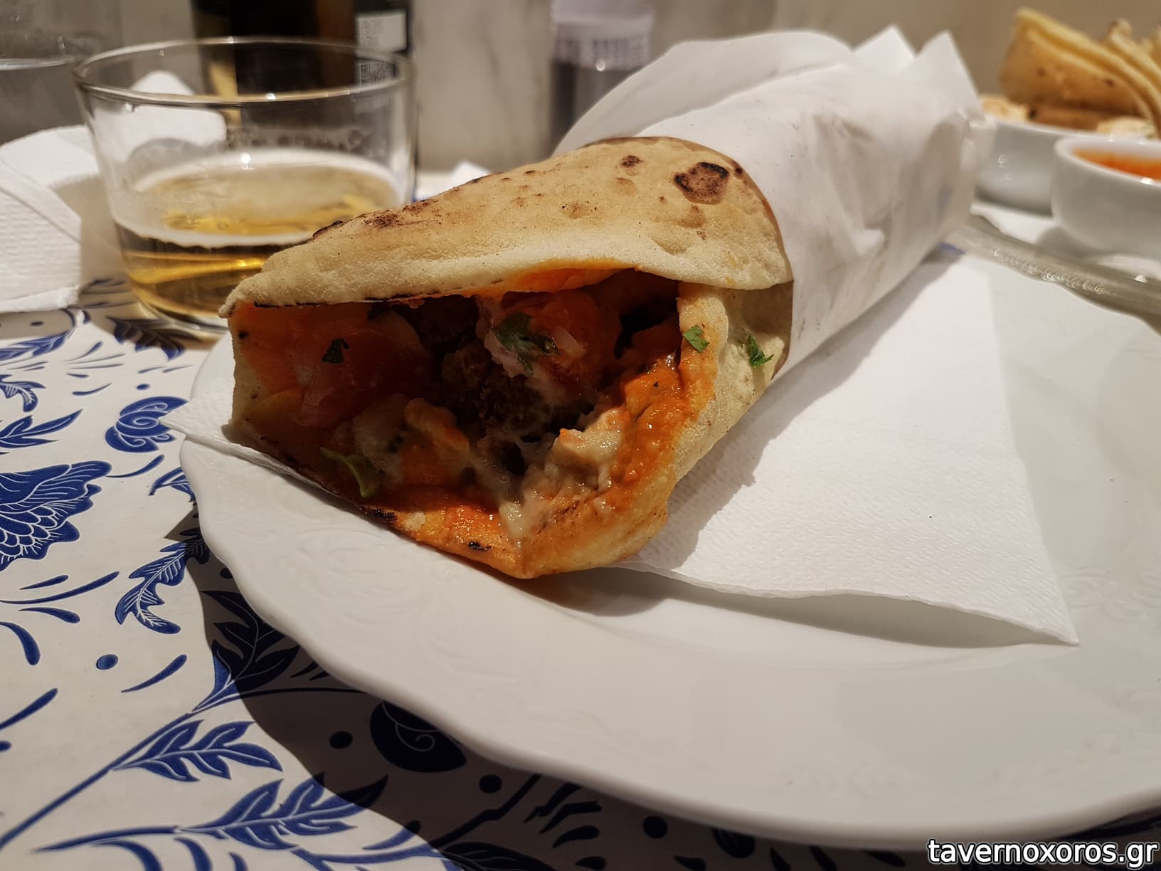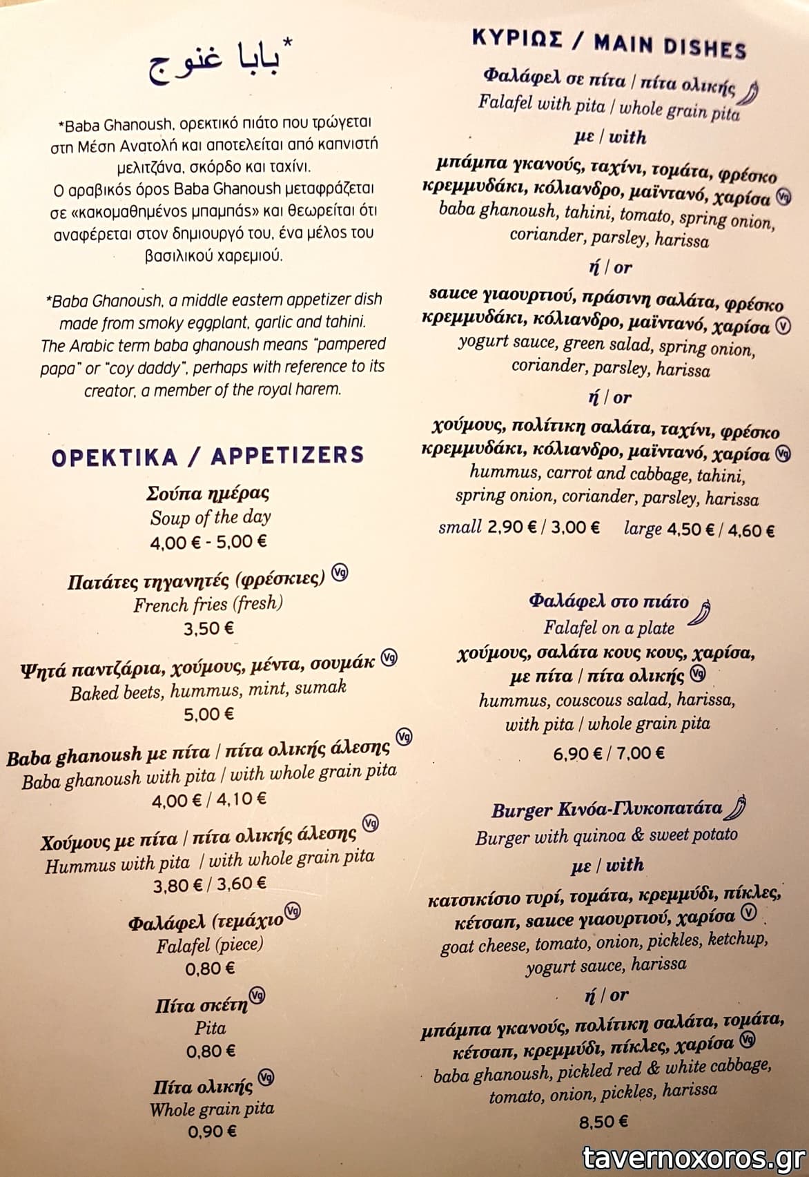 "Μικρό falafel με μπάμπα γκανούς, ταχίνι, τομάτ, φρέσκο κρεμμυδάκι, κόλιανδρο, μαϊντανό, χαρίσα" (καλό)