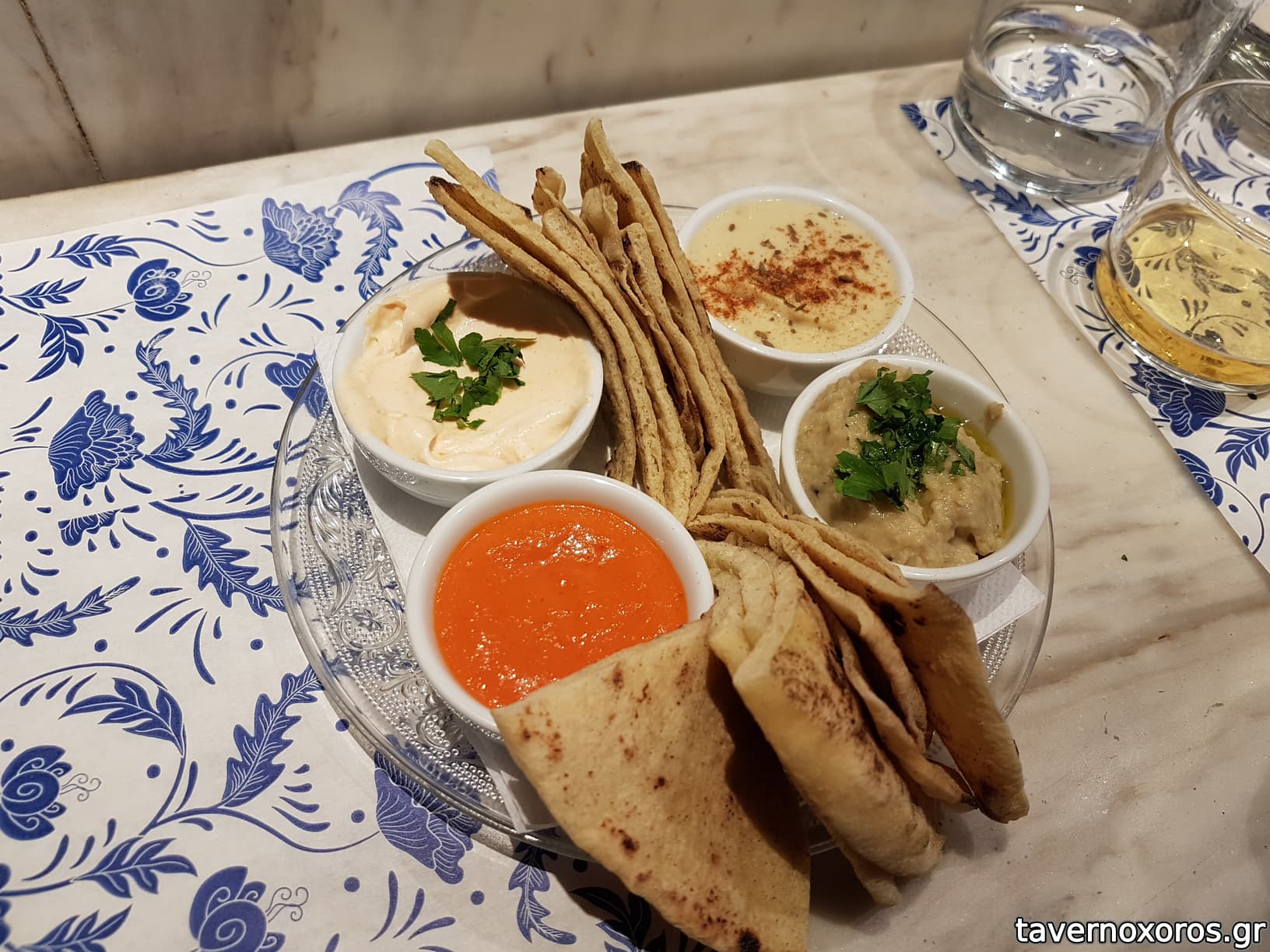4 dips: χαρίσα, sauce γιαουρτιού, χούμους, μπάμπα γκανούς (καλές οι πιτούλες, νόστιμη η χαρίσα αν και μη παραδοσιακή, νόστιμο χούμους)