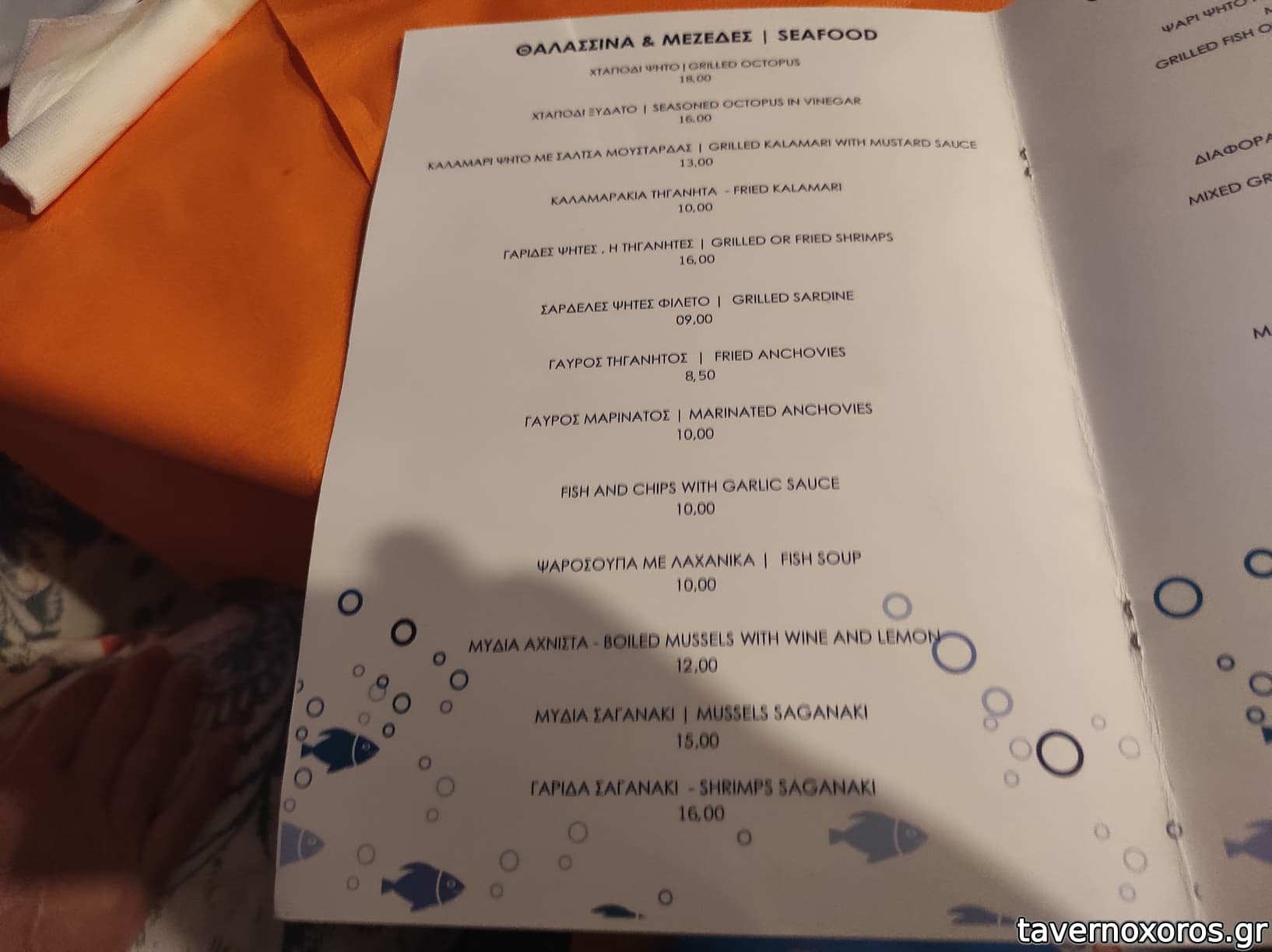 Χωριάτικη καλή, πατάτες ορίτζιναλ καλές, γαύρος μαρινάτος καλός, καλαμαράκια τηγανητά πολύ καλά, σαρδέλες ψητές καλές, τσιπούρα ψητή 850γρ. πολύ καλή. 2 μπύρες 2 αναψυκτικά κερασμένο καρπούζι=102 ευρώ. Μου άρεσε και το προτείνω.